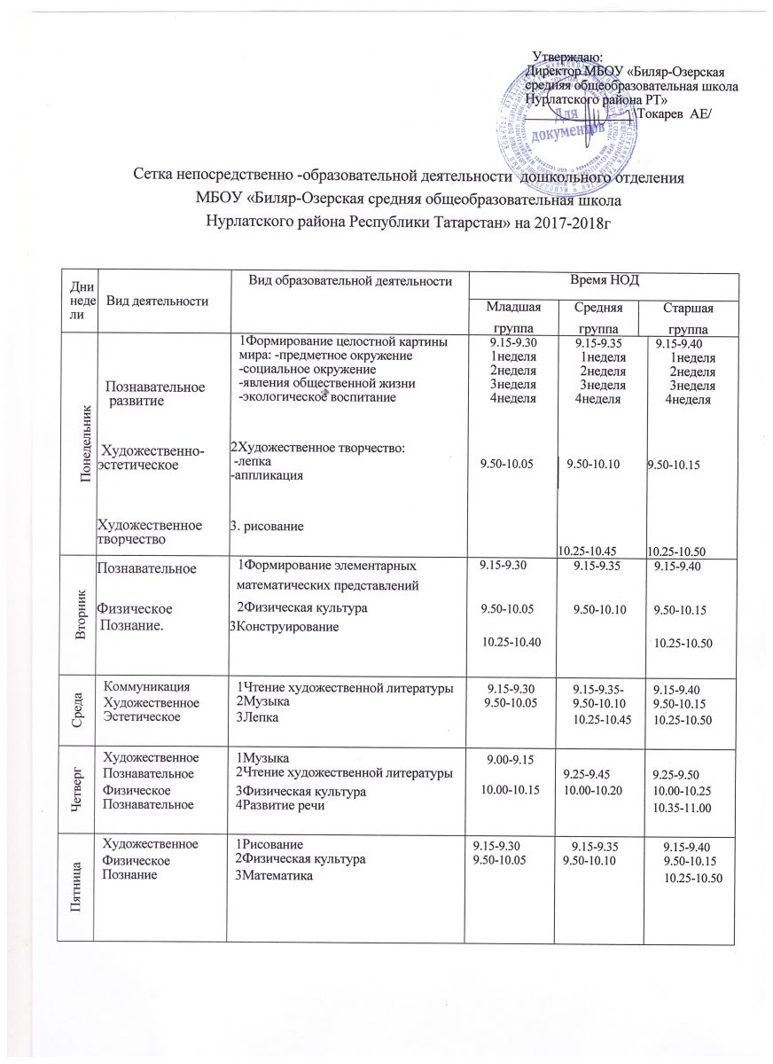 Сетка непосредственно-образовательной деятельности дошкольного отделения МБОУ "Биляр-Озерская СОШ" НМР РТ на 2017-2018 год