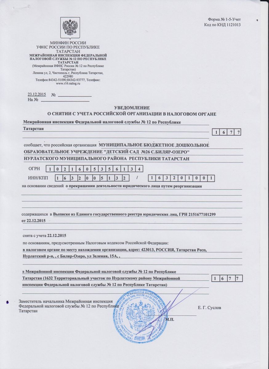 ЛИСТ ЗАПИСИ ЕДИНОГО ГОСУДАРСТВЕННОГО РЕЕСТРА ЮРИДИЧЕСКИХ ЛИЦ О ПРЕКРАЩЕНИИ ДЕЯТЕЛЬНОСТИ МБДОУ "ДЕТСКИЙ САД №26 с.БИЛЯР-ОЗЕРО" НМР РТ ПУТЕМ РЕОРГАНИЗАЦИИ В ФОРМЕ ПРИСОЕДИНЕНИЯ
