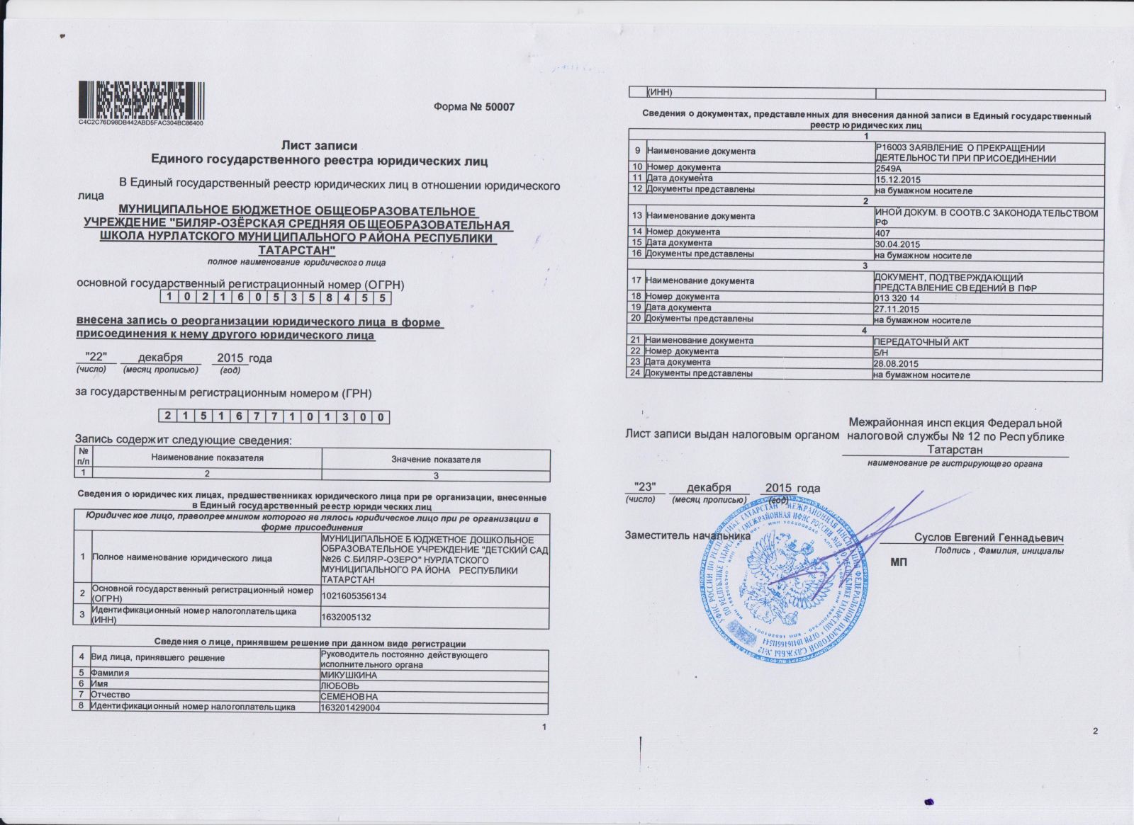 ЛИСТ ЗАПИСИ ЕДИНОГО ГОСУДАРСТВЕННОГО РЕЕСТРА ЮРИДИЧЕСКИХ ЛИЦ О РЕОРГАНИЗАЦИИ МБОУ "БИЛЯР-ОЗЕРСКАЯ СОШ" НМР РТ В ФОРМЕ ПРИСОЕДИНЕНИЯ К НЕМУ ДРУГОГО ЮРИДИЧЕСКОГО ЛИЦА