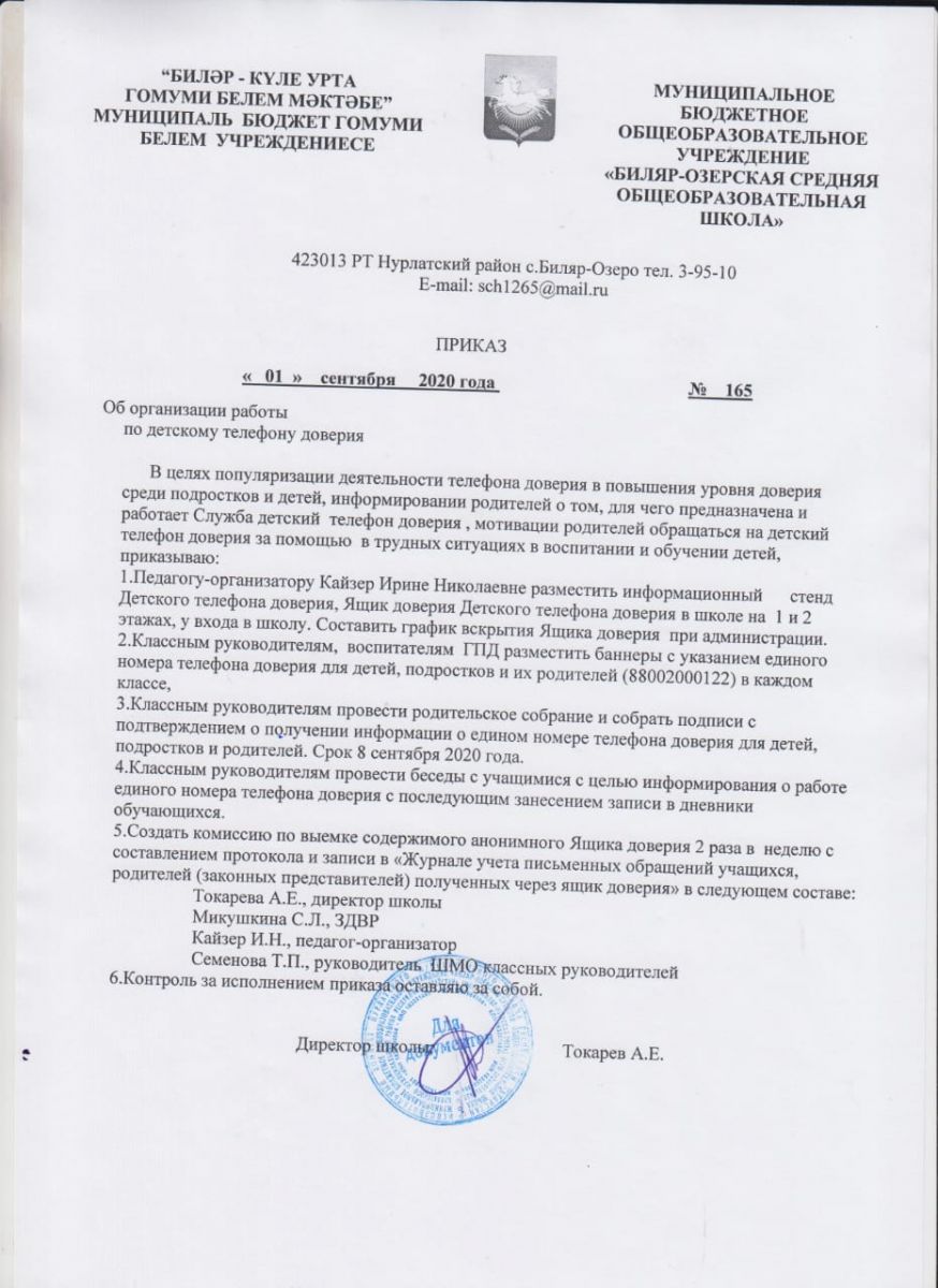 Приказ №165 от 01.09.2020 "Об организации работы детского телефона доверия"