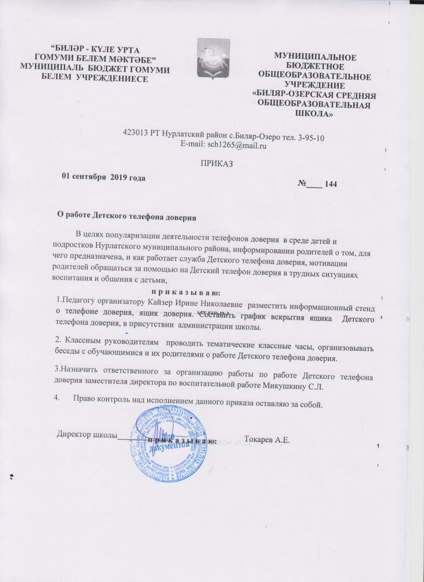 Приказ №112 от 30_08_2018 "О работе детскоготелефона доверия"