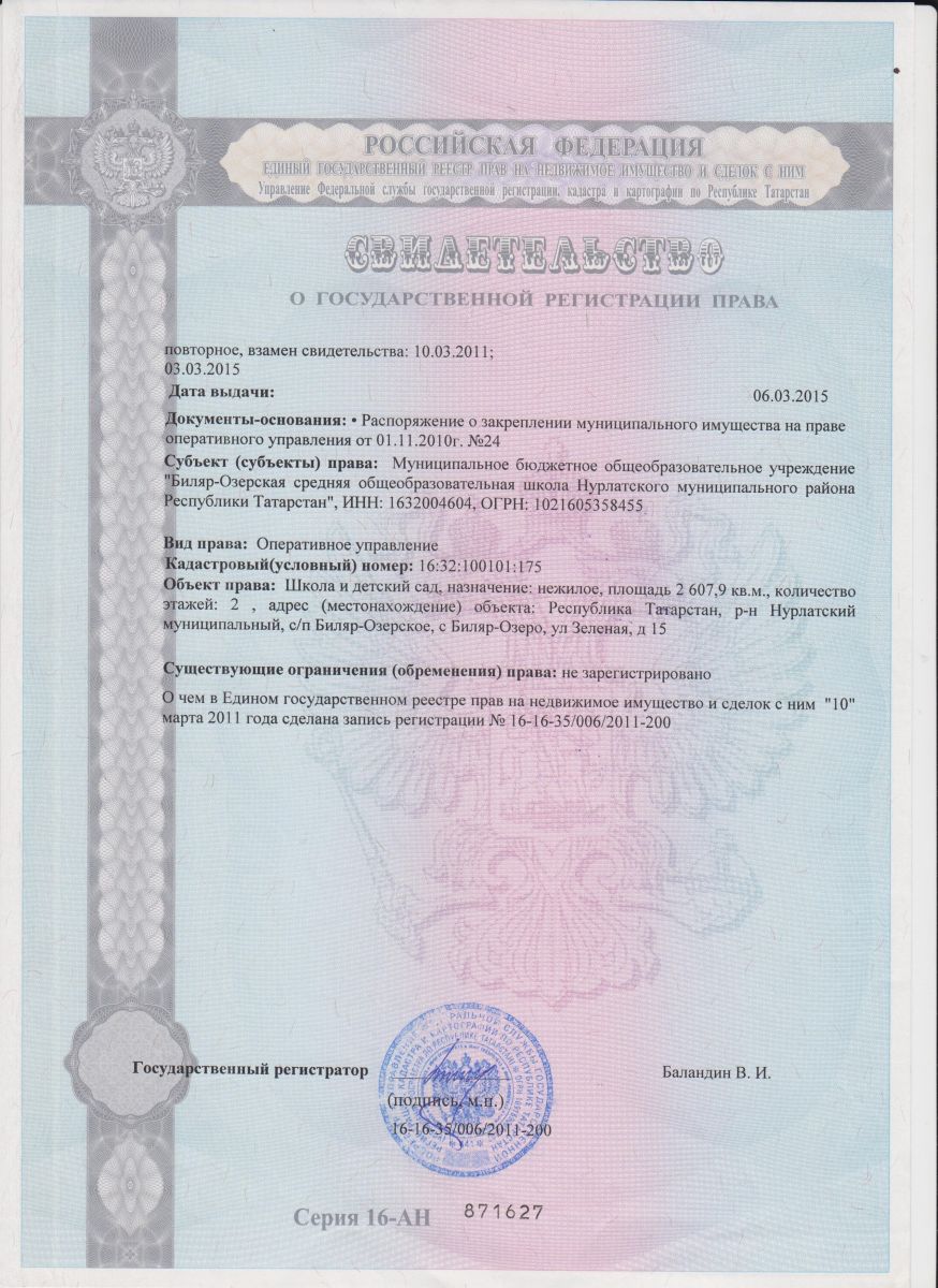 Свидетельство о государственной регистрации права (на школу, на земельный участок) / Дәүләт хокукы теркәве турында таныклык