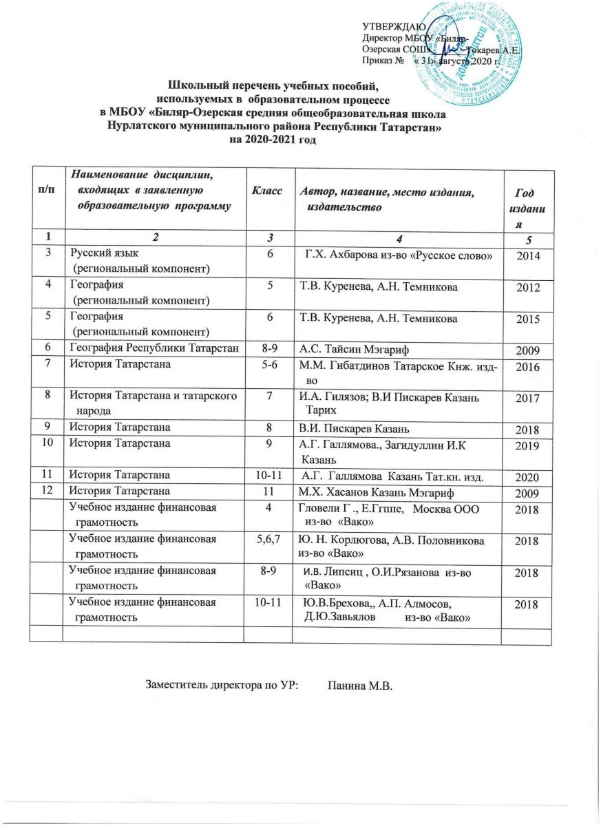 Перечень учебников на 2020-2021 учебный год МБОУ Биляр-Озерская СОШ /МБГБУ "Биләр-Күле гомуми белем бирү мәктәбе"нең 2020-2021нче уку елына дәреслекләр исемлеге