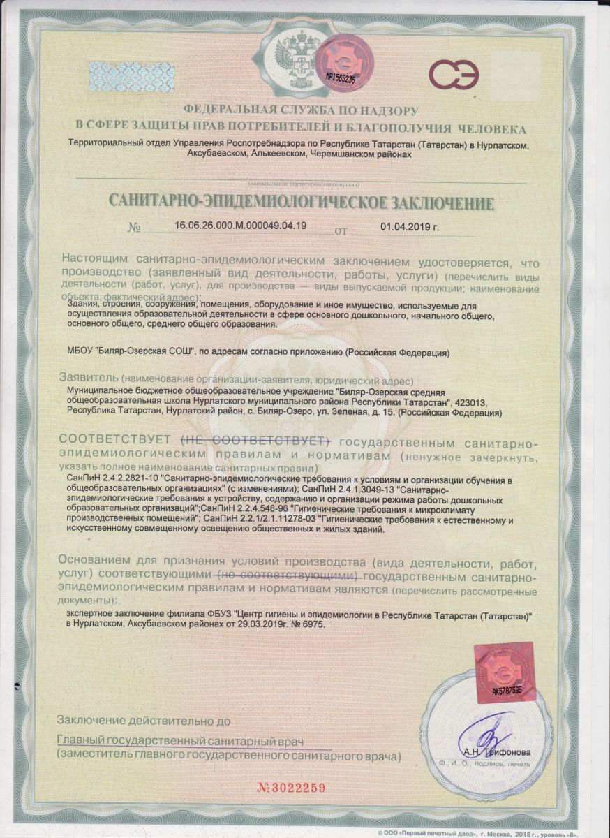 Санитарно-эпидемиологическое заключение №16.06.26.000.М.000049.04.19 от 01.04.2019 г.