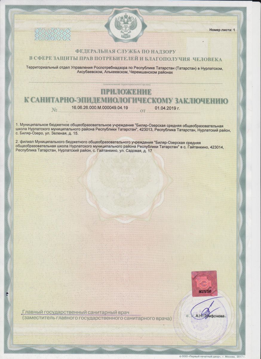 Санитарно-эпидемиологическое заключение №16.06.26.000.М.000049.04.19 от 01.04.2019 г. с приложением