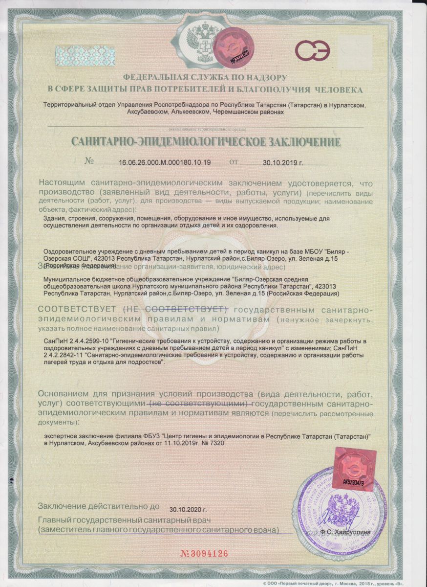 Санитарно-эпидемиологическое заключение №16.06.26.000.М.000180.10.19 от 30.10.2019 г.