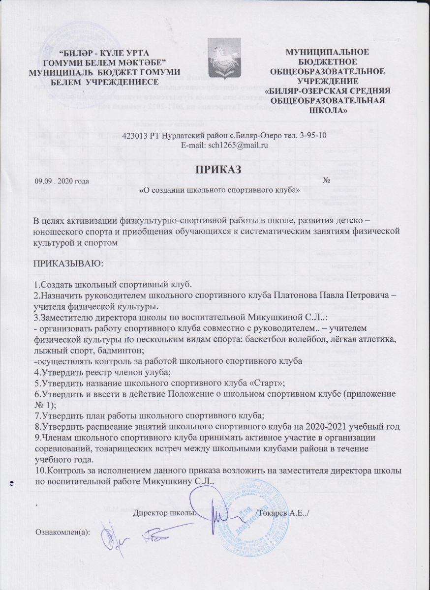 Приказ от 09.09.2020 "О создании школьного спортивного клуба"