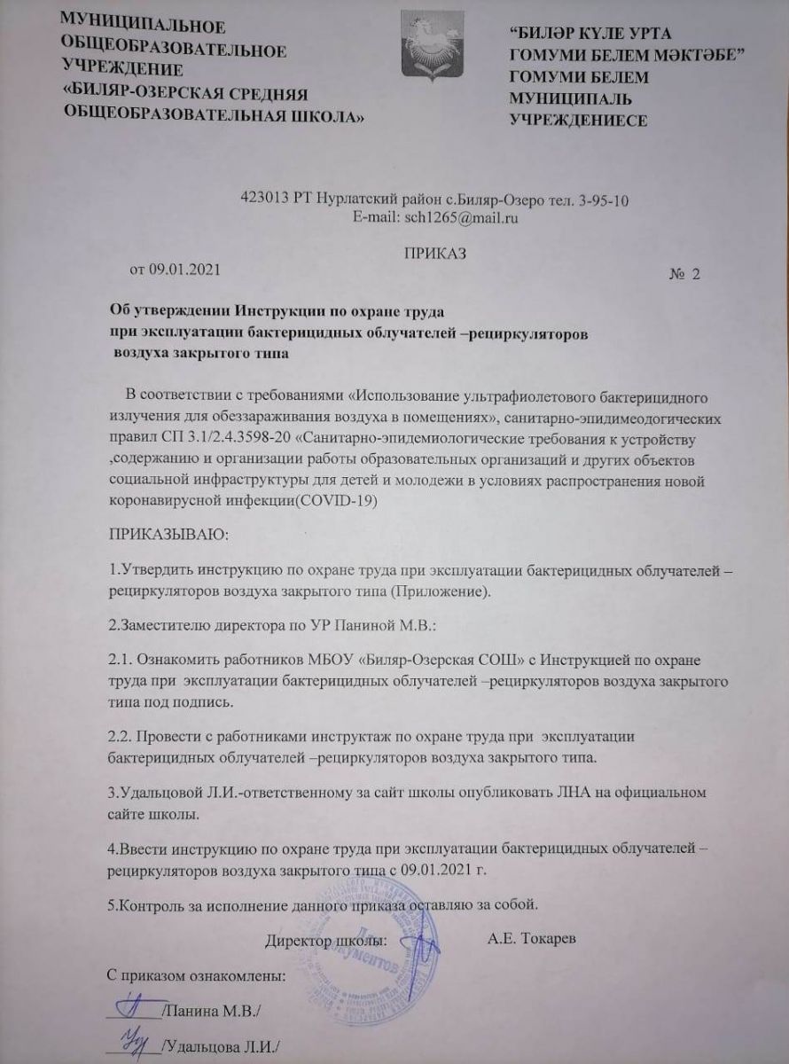 ПРИКАЗ от 09_01_2021 "Об утверждении Инструкции по охране труда при эксплуатации бактерицидных облучателей –рециркуляторов воздуха закрытого типа"