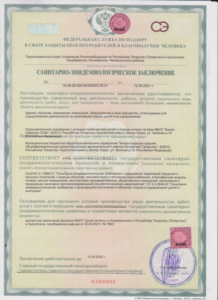 Санитарно - эпидемиологическое заключение от 12.05.2021 г. / Санитар - эпидемиологик бәяләмә