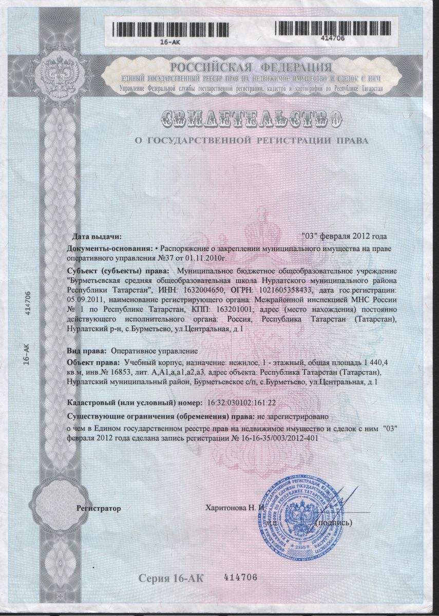| Адрес: | 423031, РТ, Нурлатский муниципальный район, с.Бурметьево, ул.Центральная, д.1/ 423031 Татарстан Республикасы, Нурлат муниципаль районы, Үзәк урамы, 1 |
