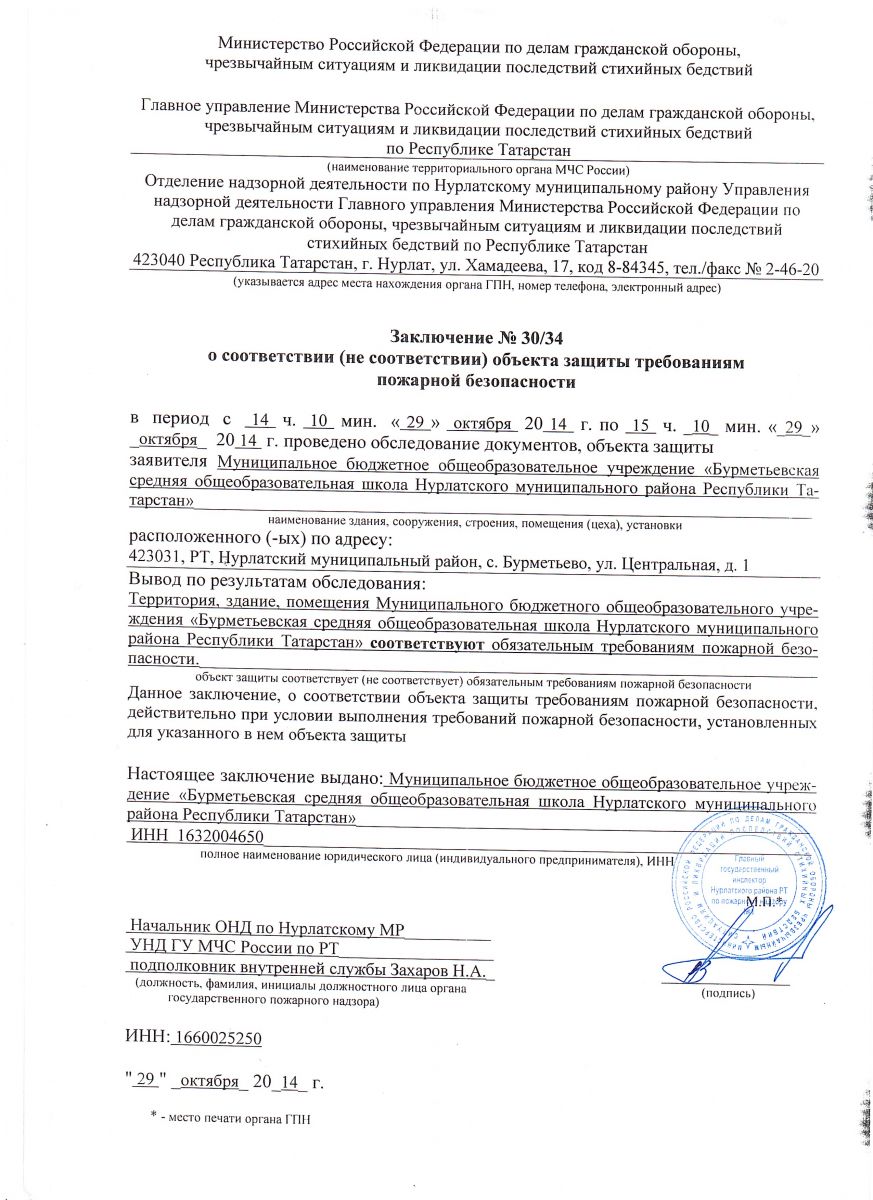 Заключение о соответствии объекта защиты требованиям пожарной безопасности / Объектның янгын куркынычсызлыгы таләпләрен яклау турында бәяләмә
