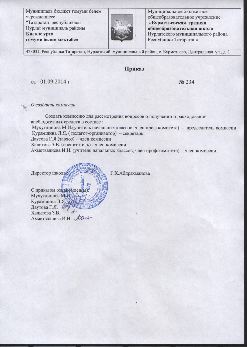 Приказ о создании комиссии для рассмотрения вопросов о получении и расходовании внебюджетных средств /Бюджеттан тыш акчаны алу һәм сарыф итү буенча эшләрне карау комиссия төзү турында боерык