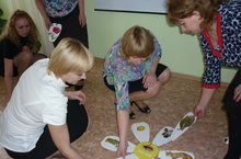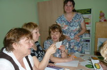 Каждую среду воспитатель татарского языка Камалова Г.Г. проводит обучение русскоязычных педагогов татарскому языку. 15 апреля обучение прошло в необычной форме. Педагоги работали в парах. Им были предложены карточки, по которым они составляли диалоги, общались друг с другом. Основным условием было то, что нельзя на русском языке называть те слова, перевод которых на татарский язык педагогам уже известен. В технологии коммуникативного общения широко использовался принцип речевого развития.