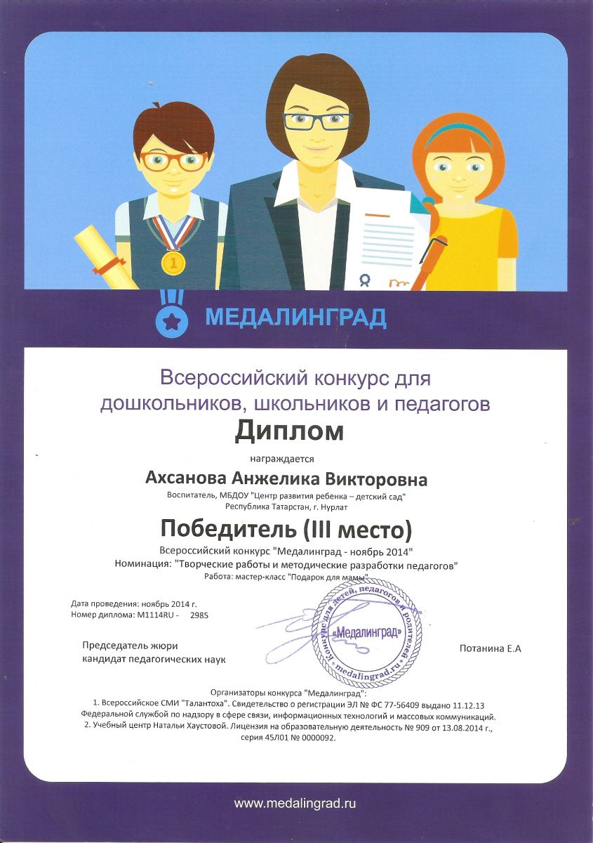 Всероссийский конкурс для дошкольников, школьников и педагогов "Медалинград - ноябрь 2014"