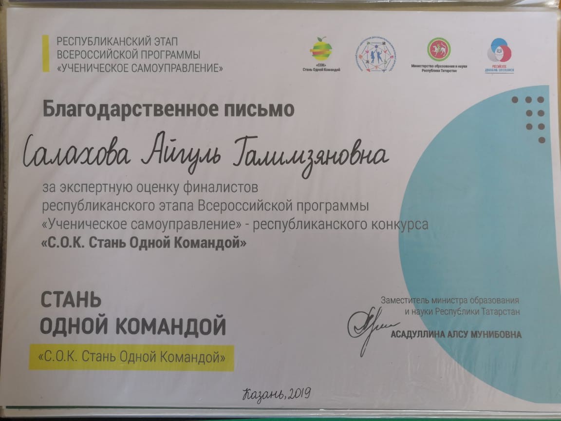 Благодарственное письмо - профильная смена "С.О.К. Стань Одной Командой"