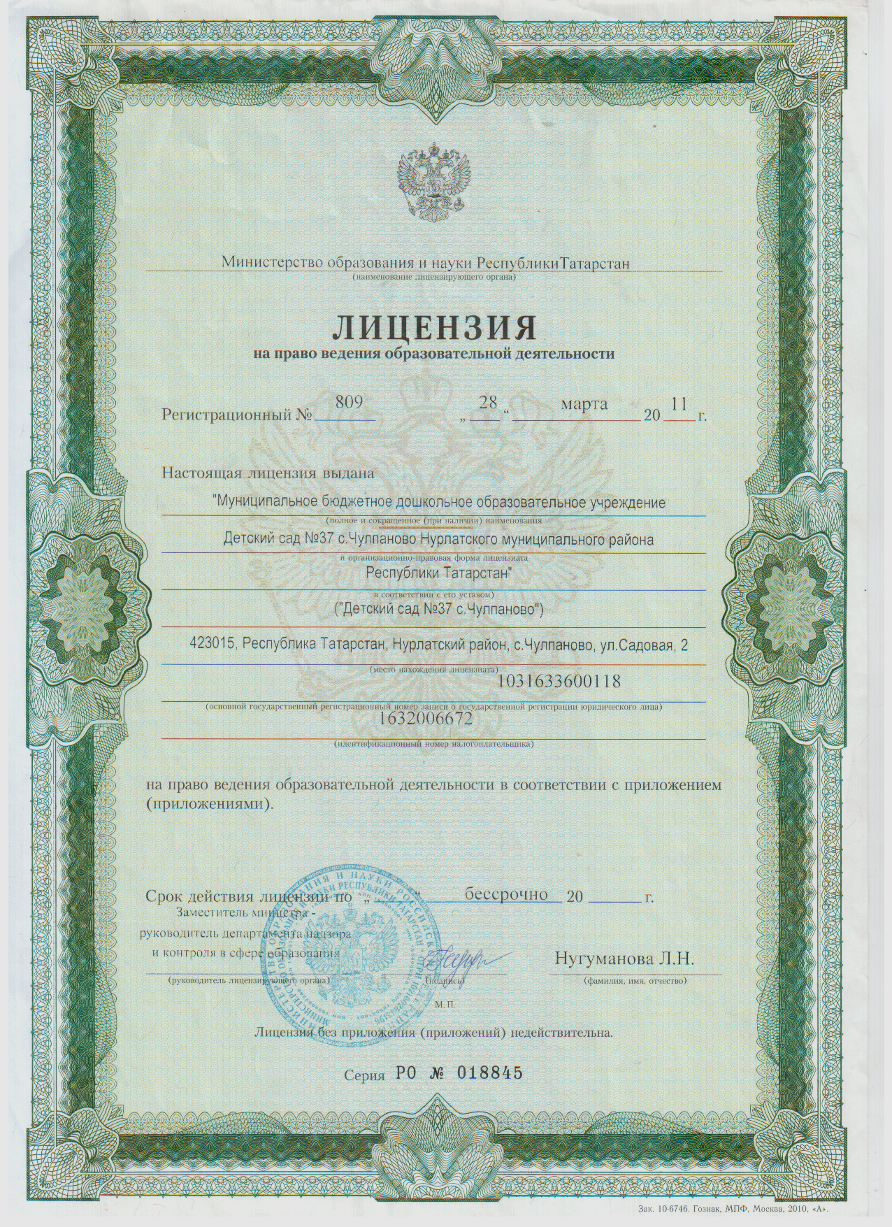 | Адрес: | 423015, Республика Татарстан, Нурлатский район, с. Чулпаново, ул.Садовая, д.2 / 423015,Бакчачы урамы,2-йорт Чулпан авылы Нурлат районы Татарстан Республикасы |