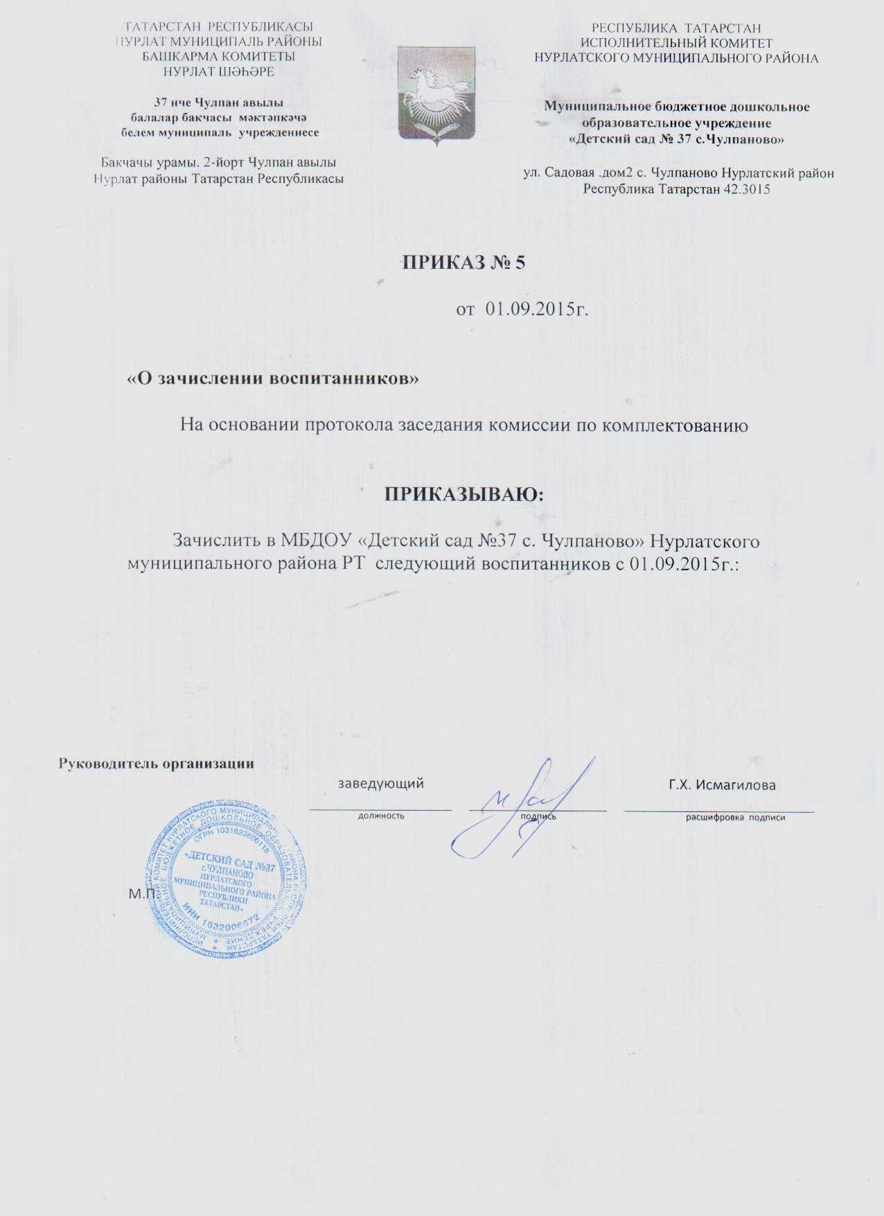 Приказ №5 от 01.09.2016г о зачислении воспитанников на основании протокола заседания комиссии по комплектованию № 357 от 08.07.2016г и направления отдела образования исполнительного комитета Нурлатского муниципального района РТ
