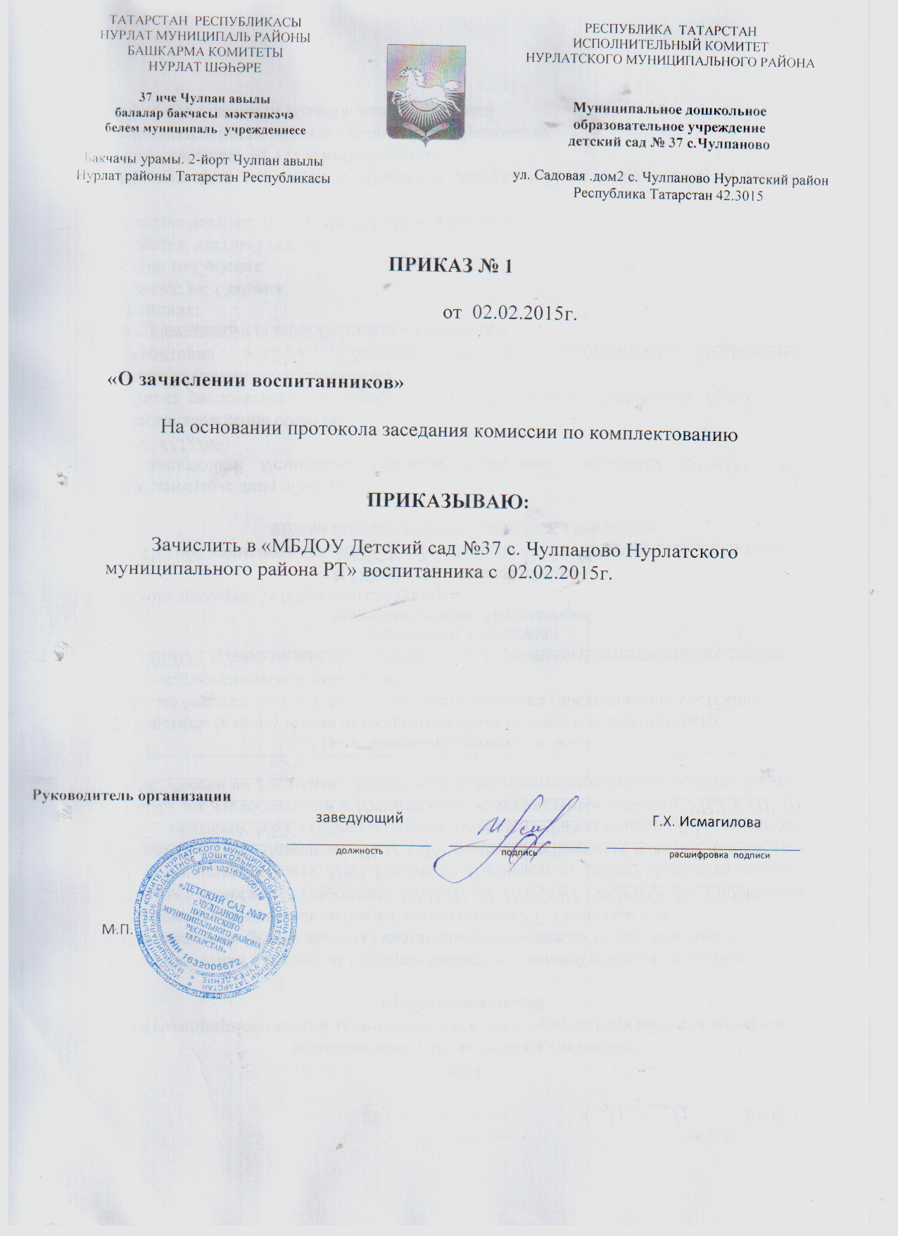 Приказ №1 от 09.01.2017 о зачислении воспитанников на основании протокола заседания комиссии по комплектованию №476 от09.01.2017г и направления отдела образования исполнительного комитета Нурлатского муниципального района РТ