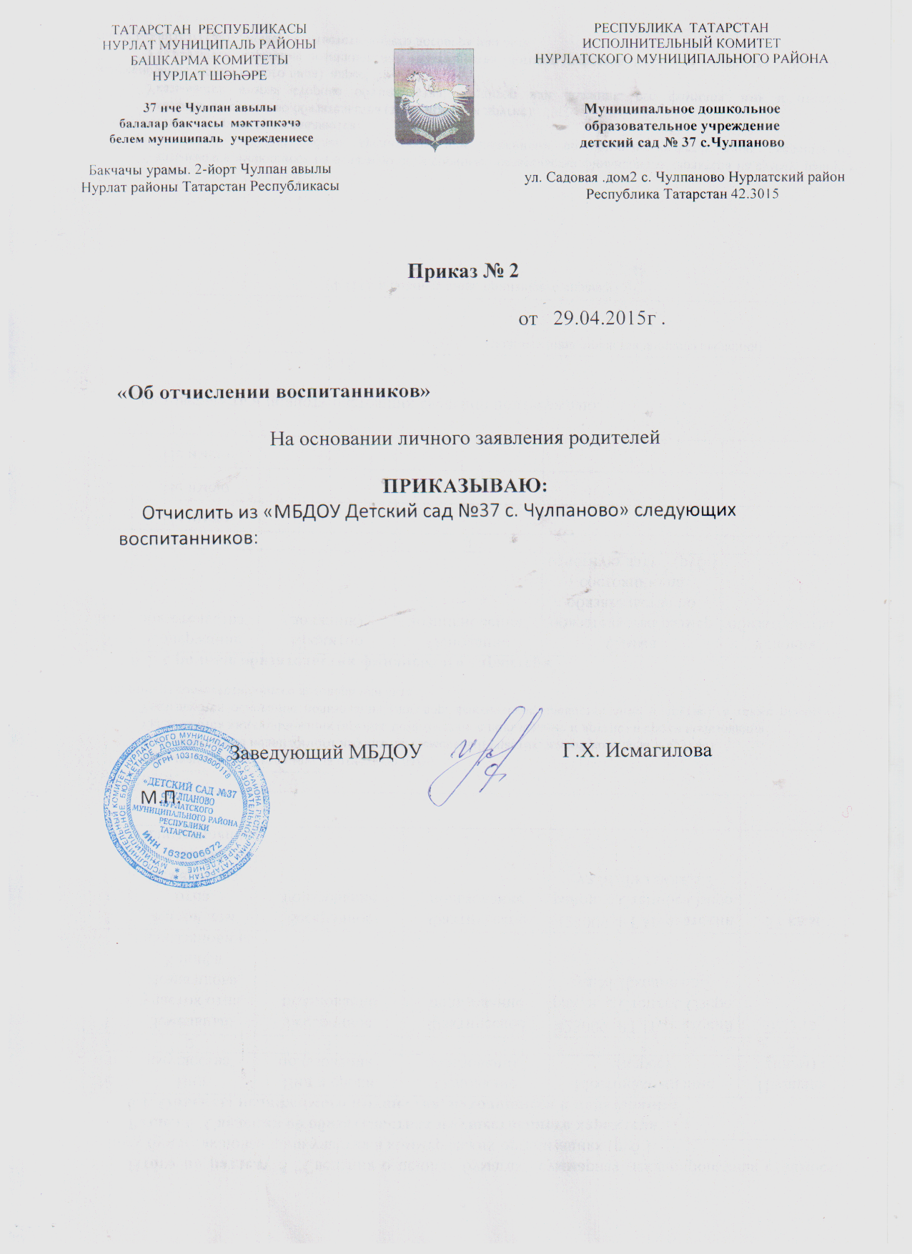 Приказ № 2 "Об отчислении воспитанников" / 2 нче номерлы "Балаларның бакчаны төгәлләве " боерыгы