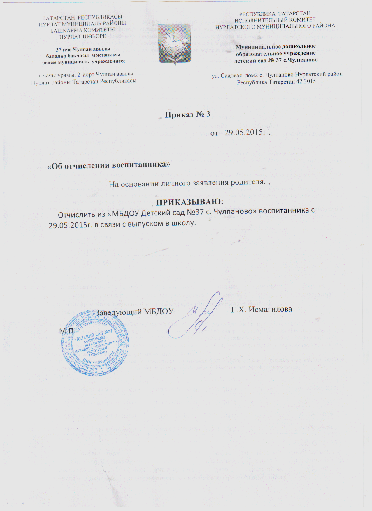 Приказ № 3 "Об отчислении воспитанника" / 3 нче номерлы "Баланың бакчаны төгәлләве" боерыгы