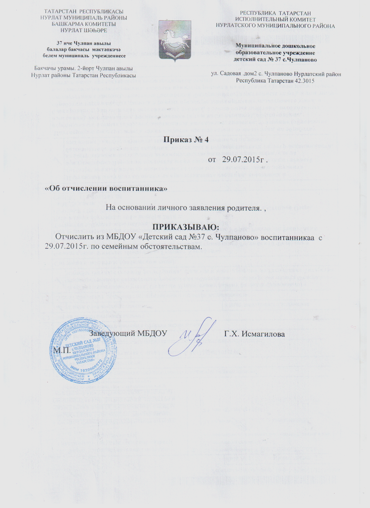 Приказ №4 "Об отчислении воспитанника" / 4 нче номерлы "Баланың бакчаны төгәлләве" боерыгы