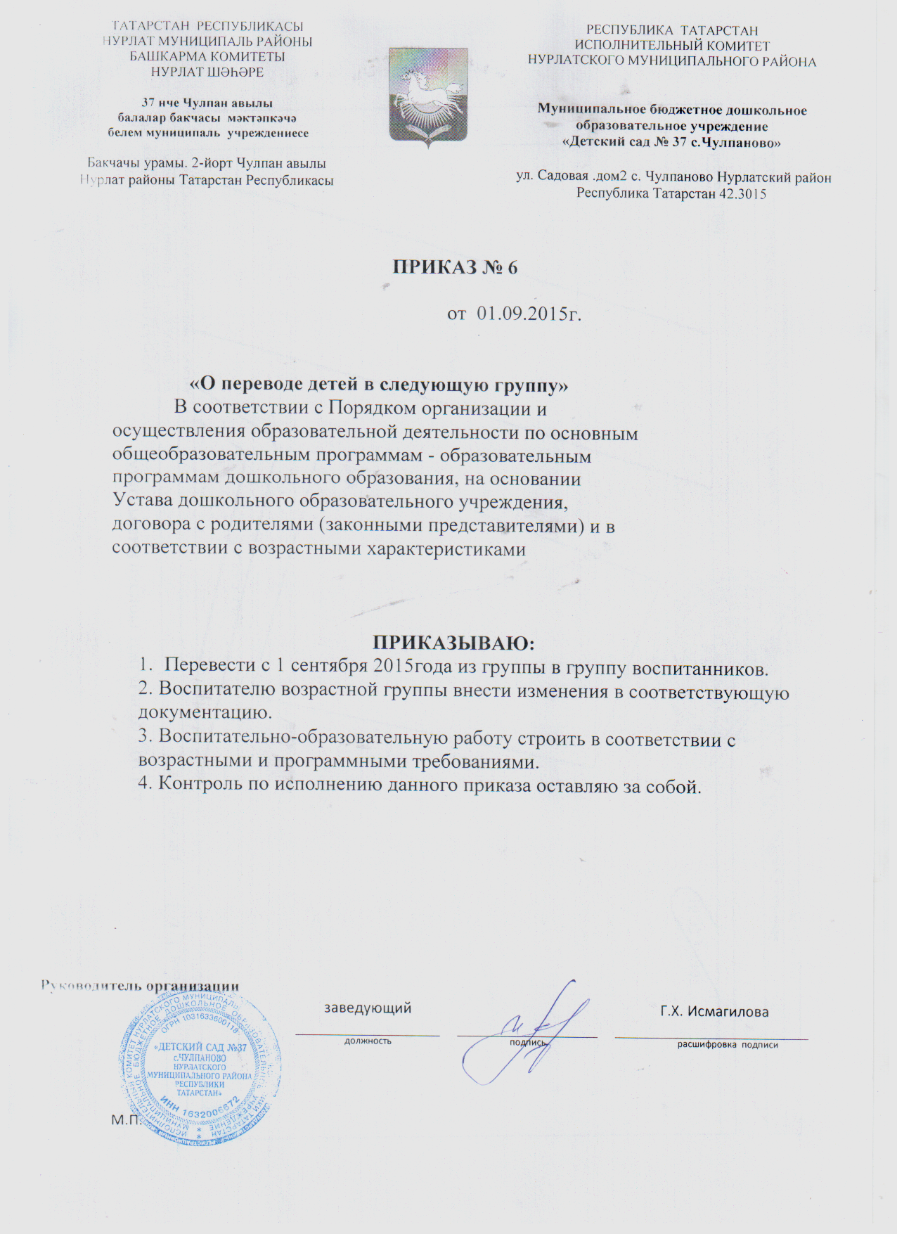 Приказ №6 "О переводе воспитанников в следующую группу" / 6 нчы номерлы "Балаларны группадан группага күчерү" боерыгы