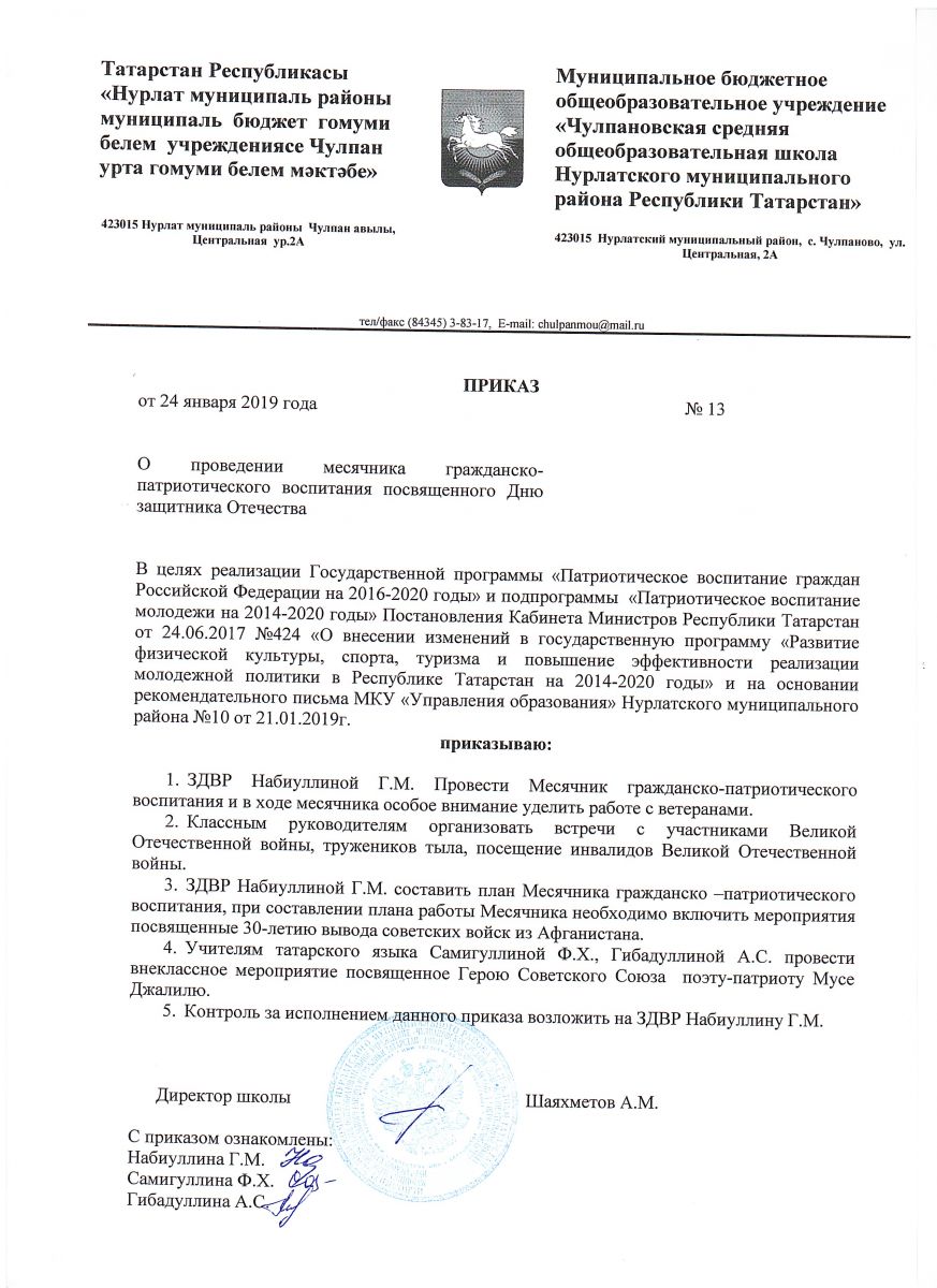 Приказ №13 от 24 01 2019 "О проведении месячника гражданско-патриотеческого воспитания"