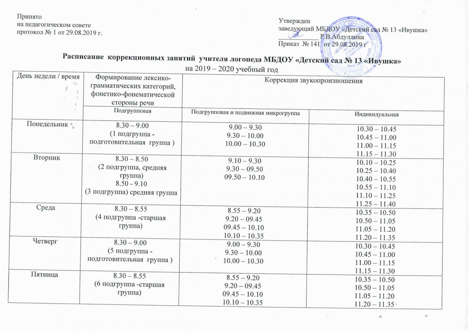 Расписание коррекционных занятий учителя логопеда на 2019 - 2020 учебный год