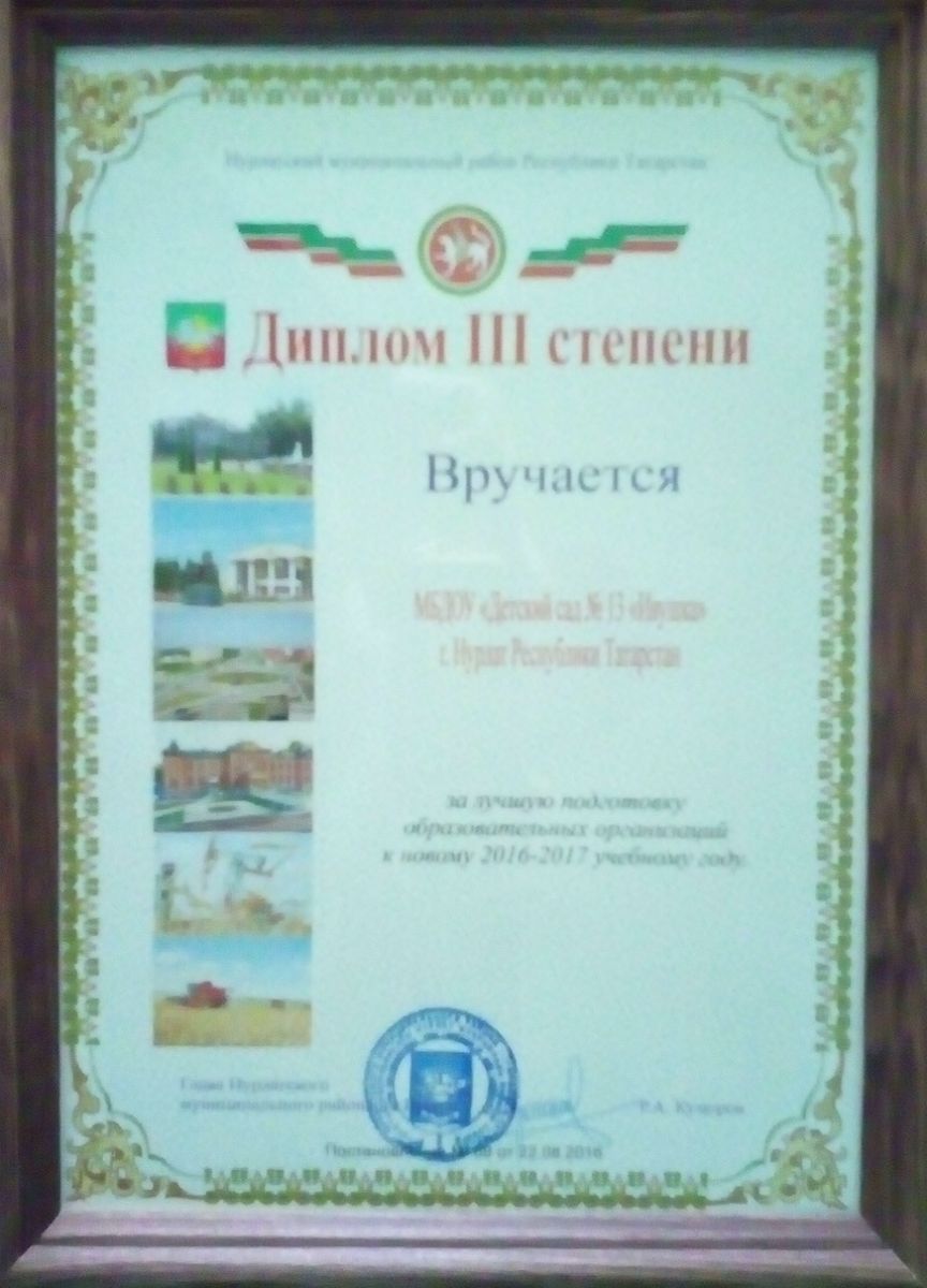 Диплом III степени за подготовку к новому 2016 - 2017 учебному году