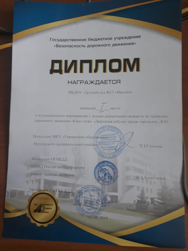Диплом 1 место "Квест игра "Дорожная азбука"
