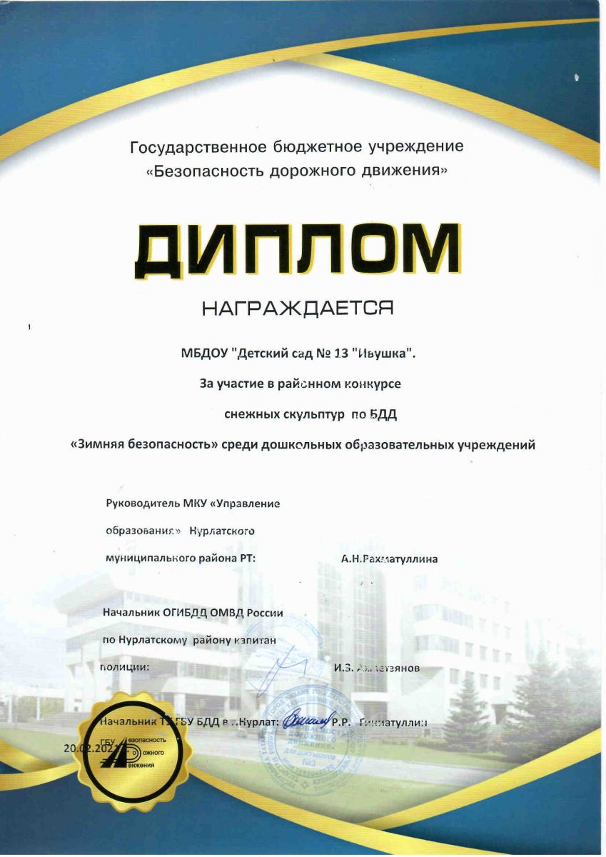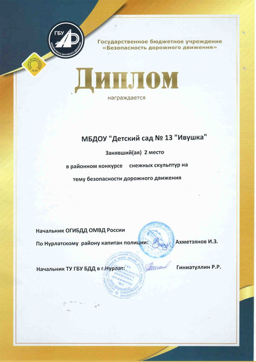 Диплом 2 место в районном конкурсе снежных скульптур на тему безопасности дорожного движения