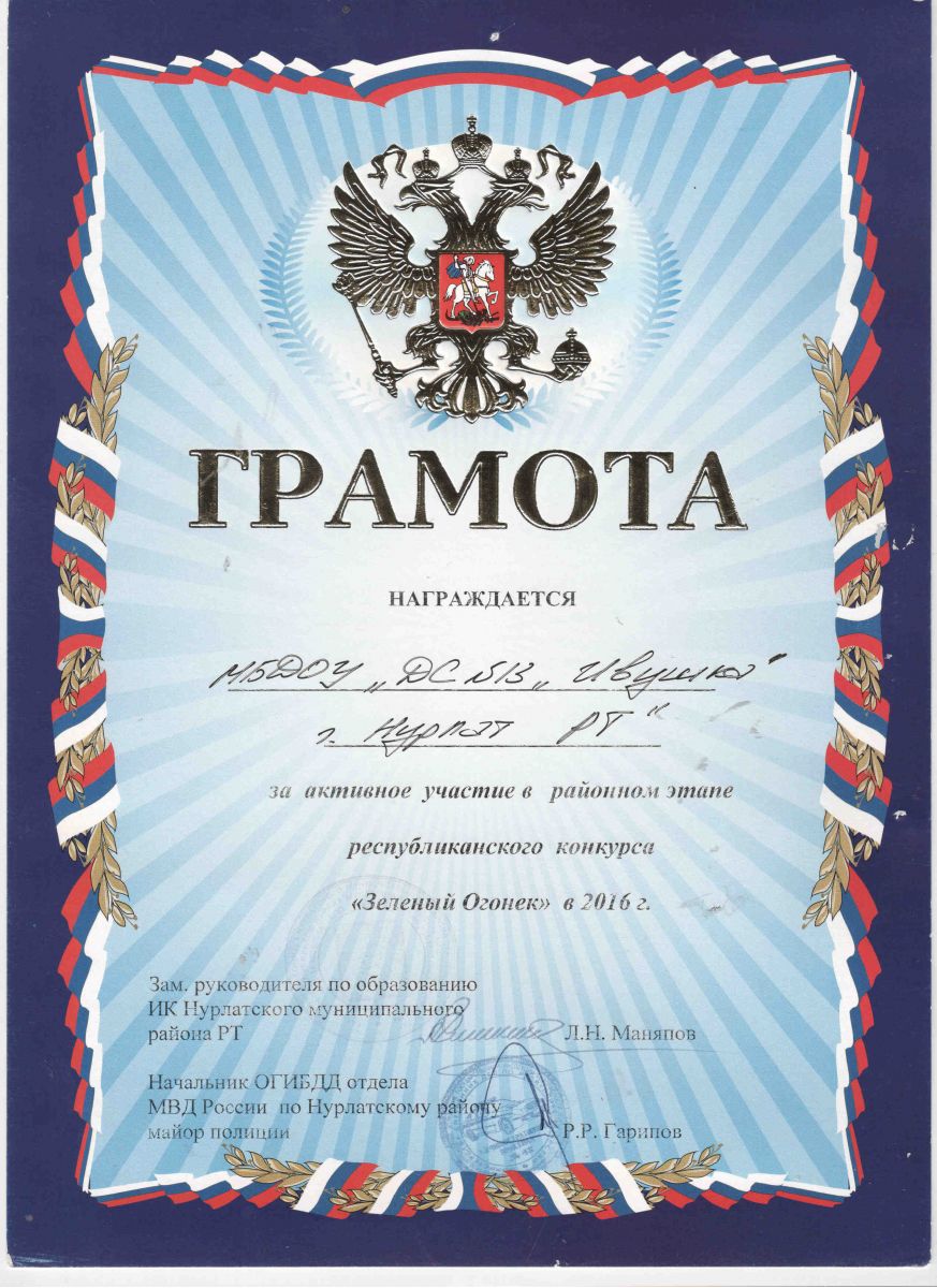 Грамота за активное участие в районном этапе конкурса "Зеленый огонек" 2016 год