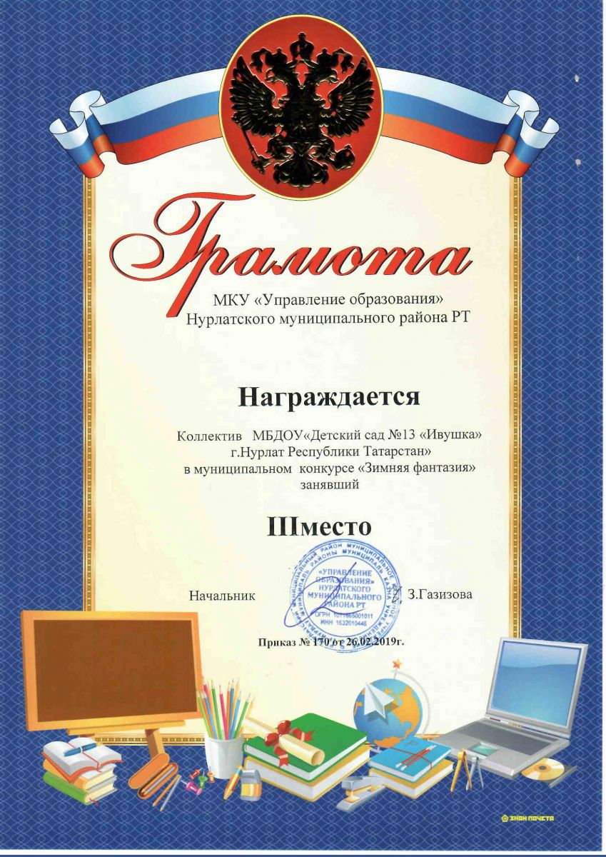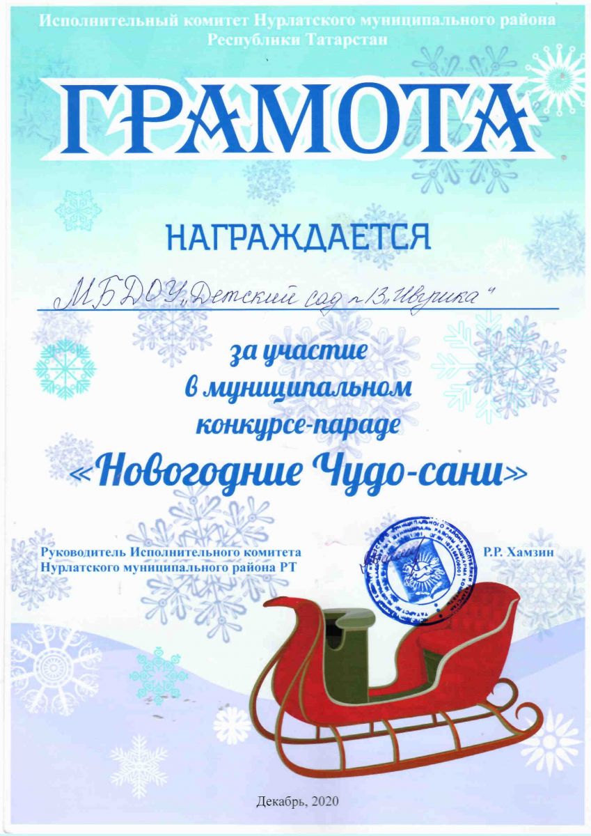 Грамота за участие в муниципальном конкурсе-параде "Новогодние Чудо-сани"