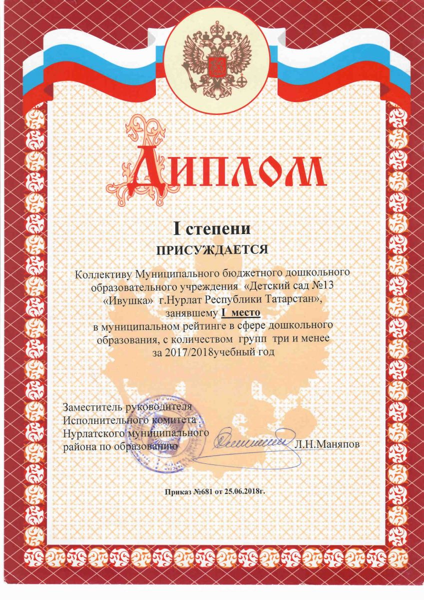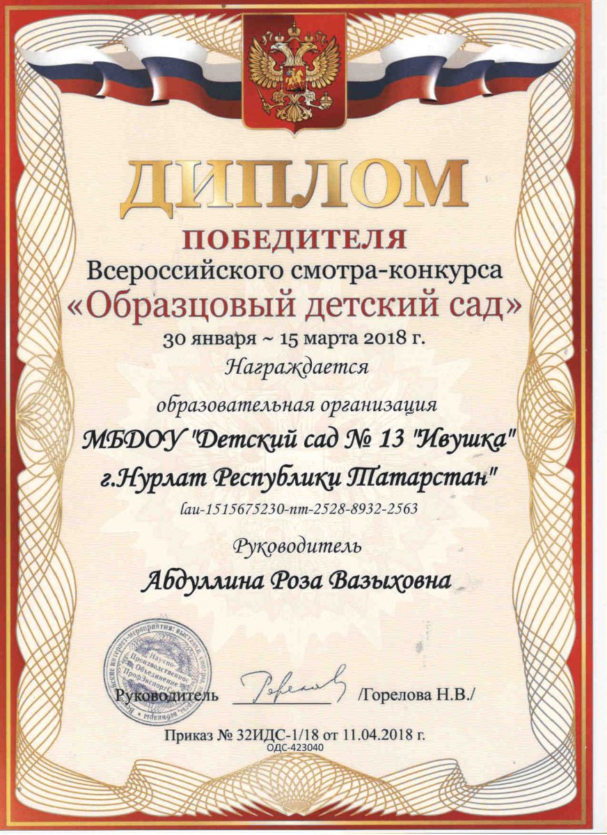 Диплом победителя Всероссийского смотра-конкурса "Образцовый детский сад" 2018 год
