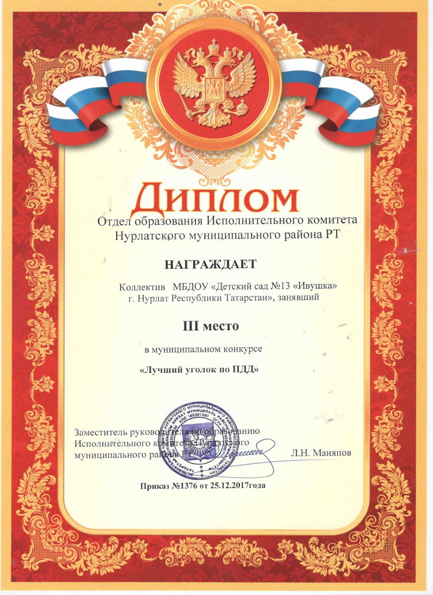 Диплом 3 место в муниципальном конкурсе "Лучший уголок по ПДД"