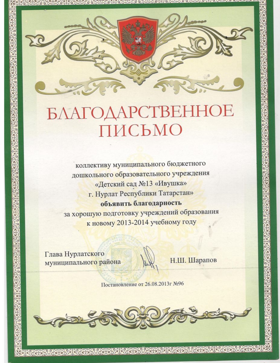 Благодарственное письмо от 26 августа 2013 года