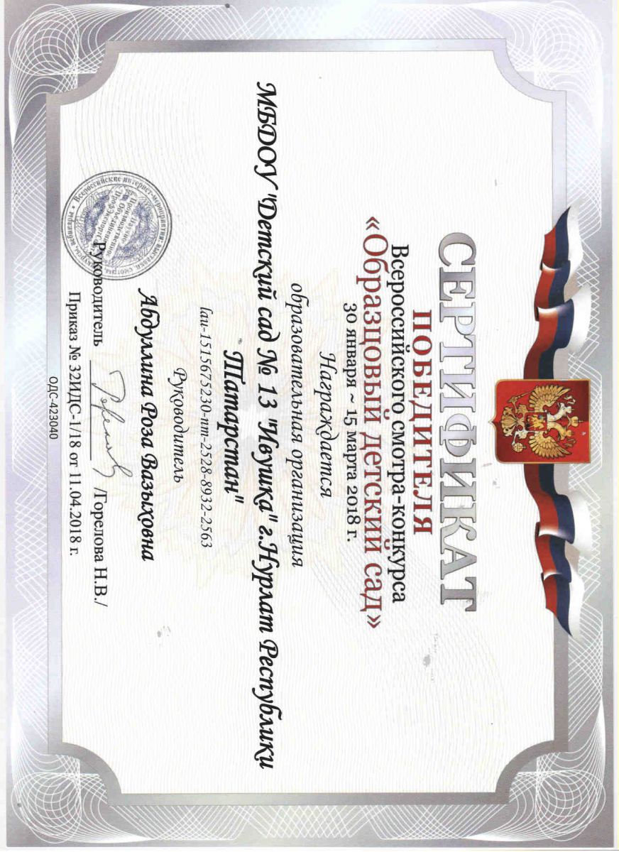 Сертификат победителя Всероссийского смотра-конкурса "Образцовый детский сад" 2018 год