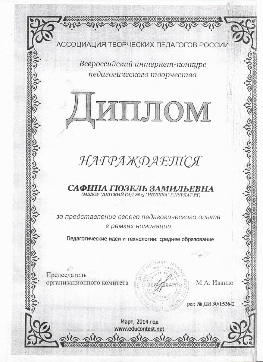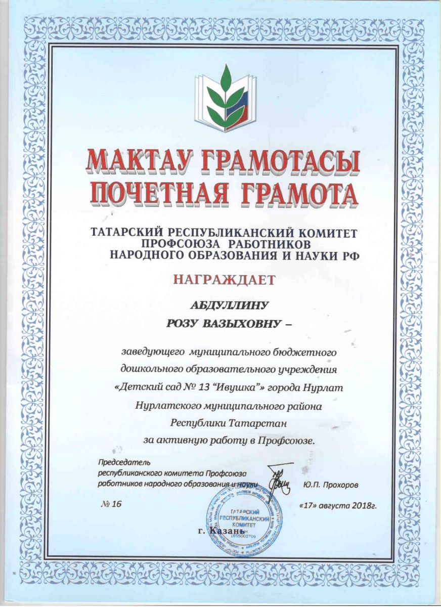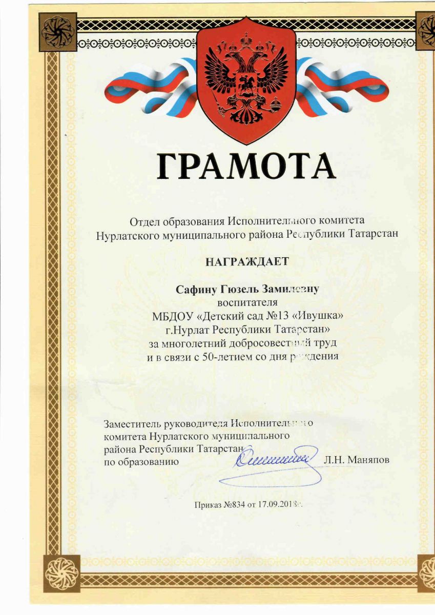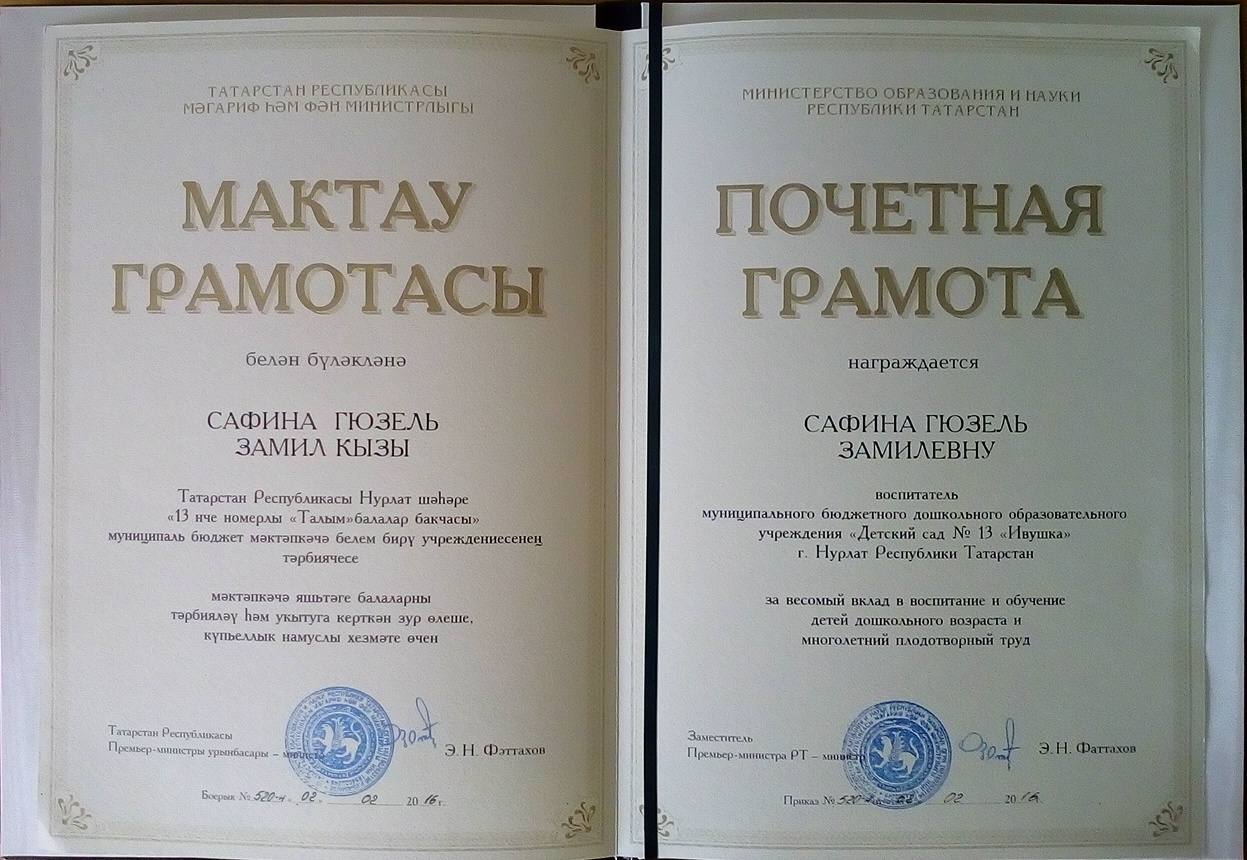 Почетная грамота Министерства образования и науки Республики Татарстан (Сафина Г.З.)