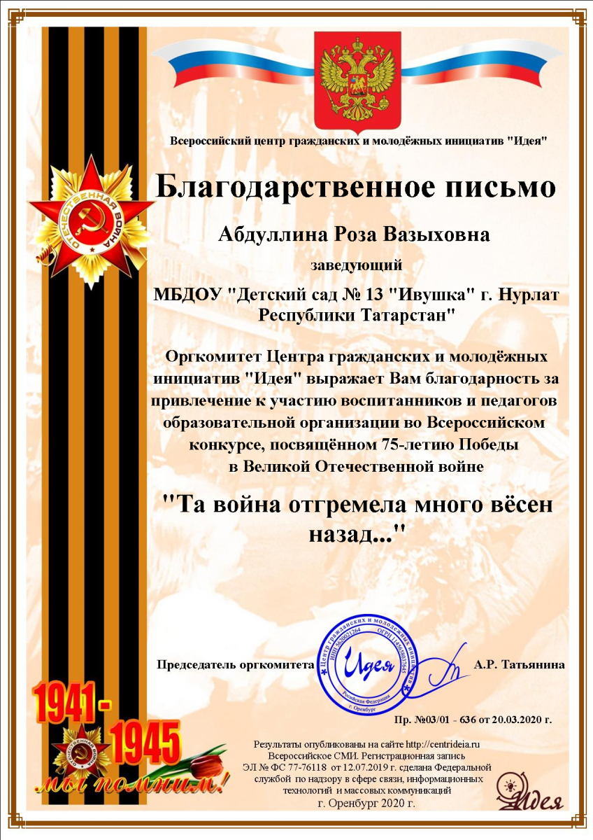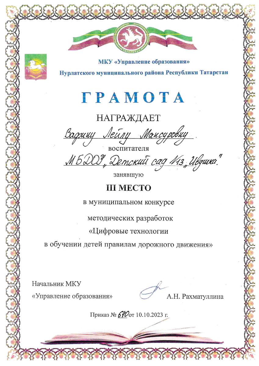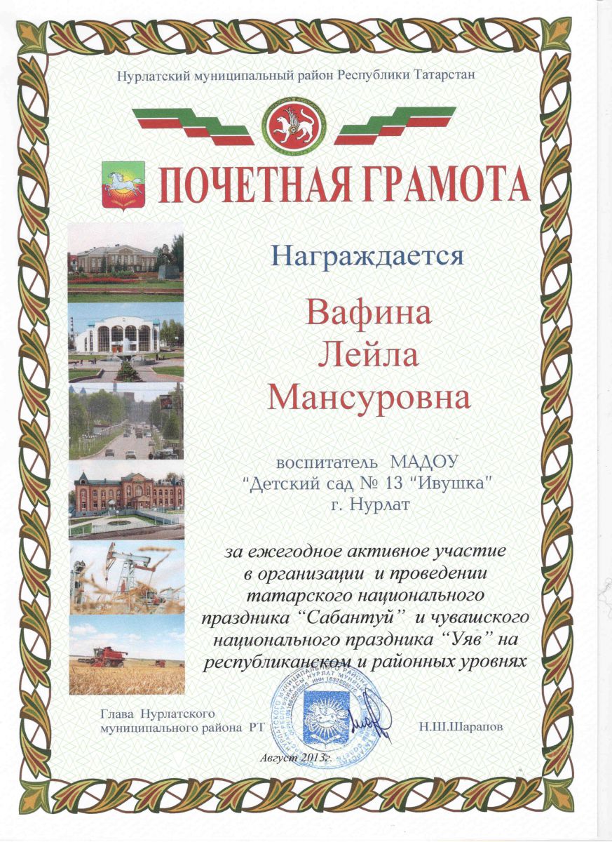 Благодарственное письмо. Татарча диктант. Вафина Лейла Мансуровна
