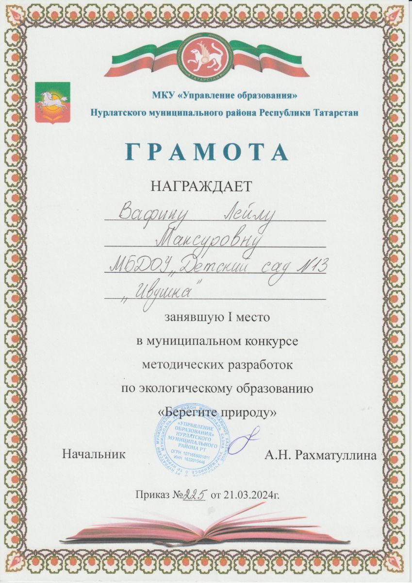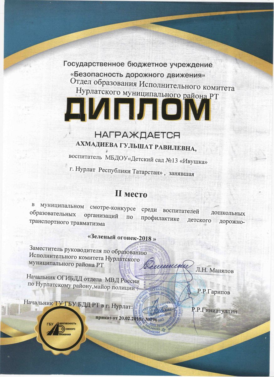 Грамота 3 место "Зелёный огонёк" Ахмадиева Г.Р.