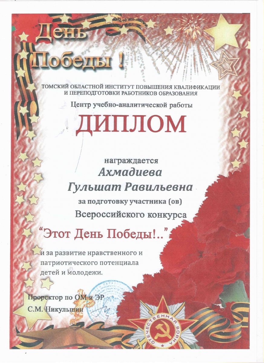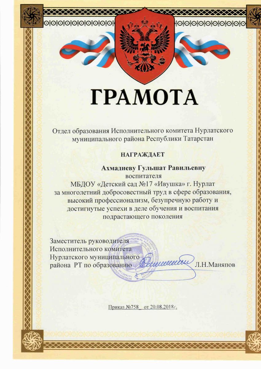 Грамотой районного отдела образования награждается Ахмадиева Г.Р.