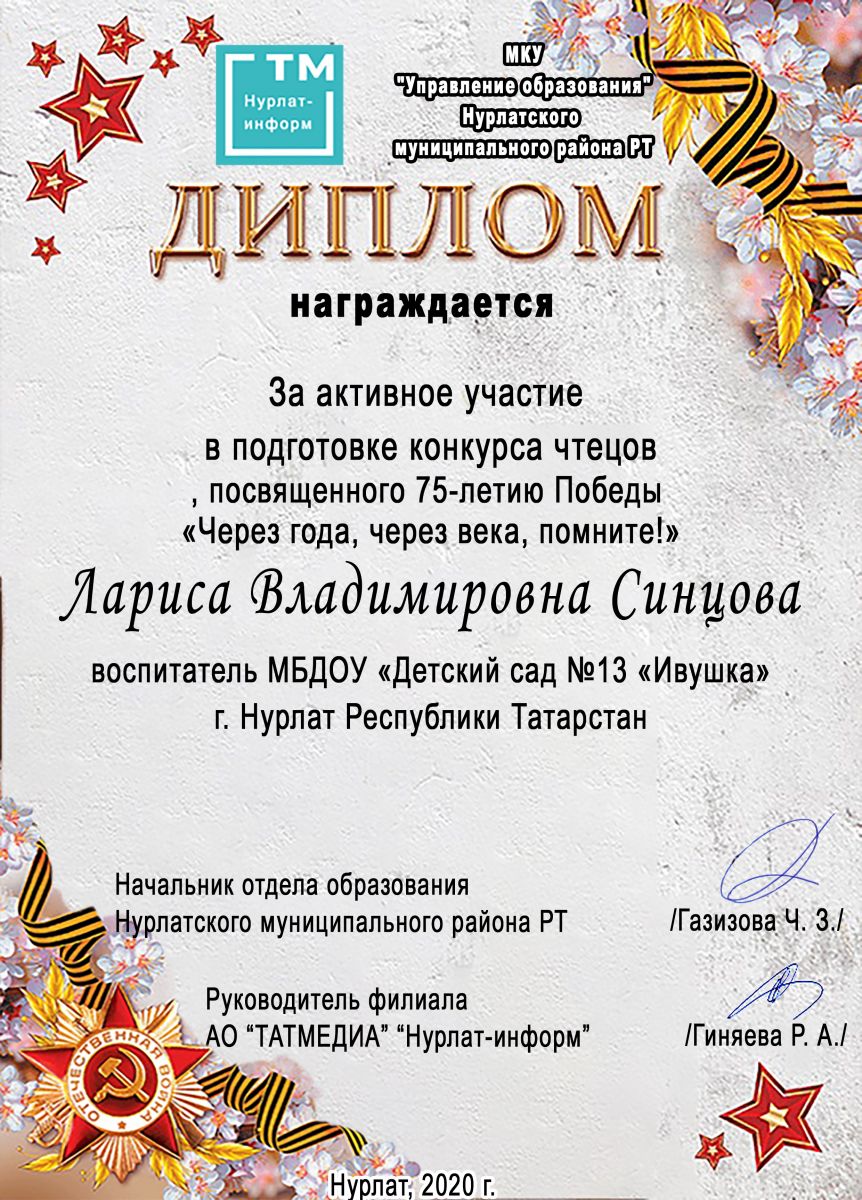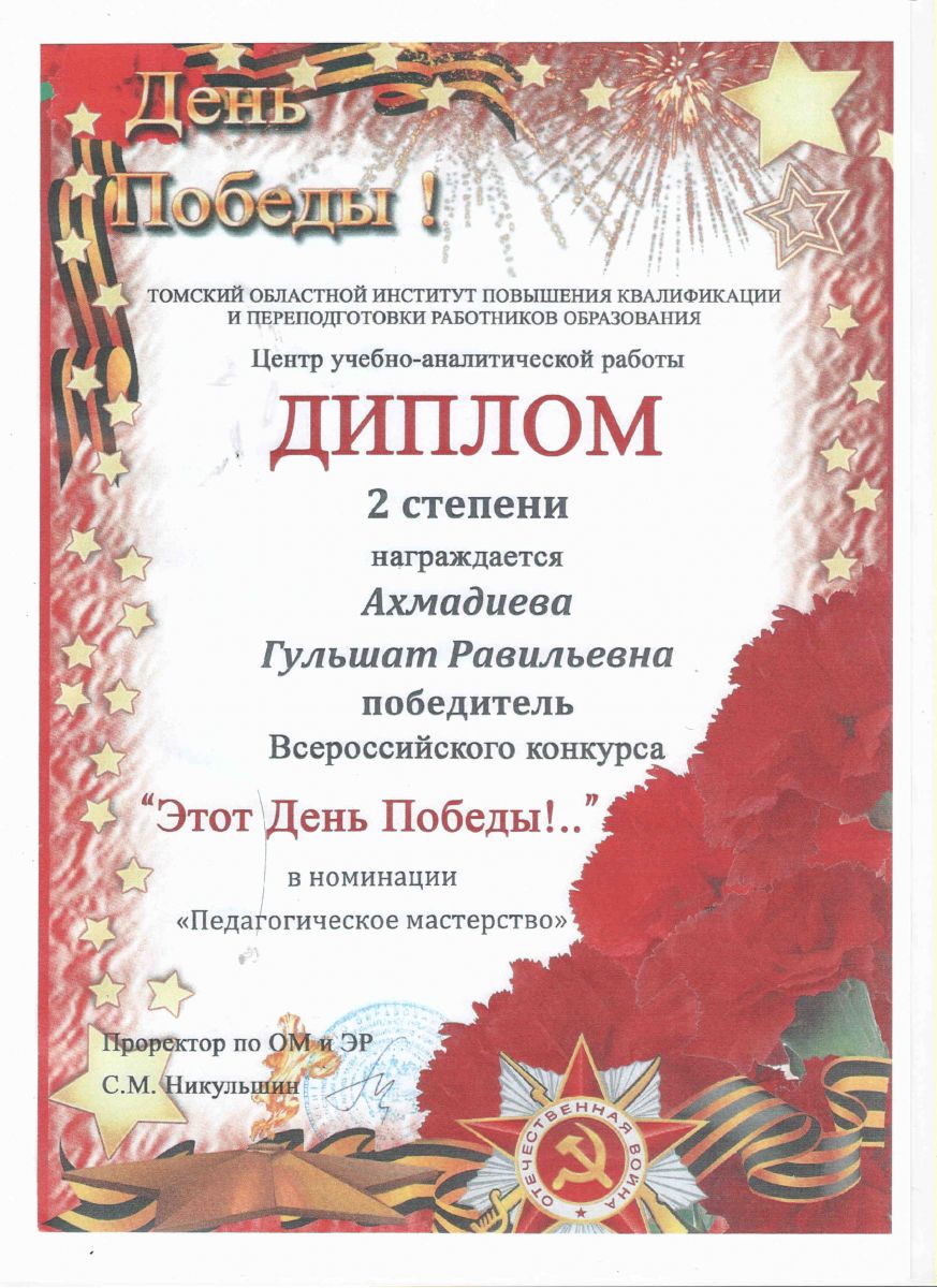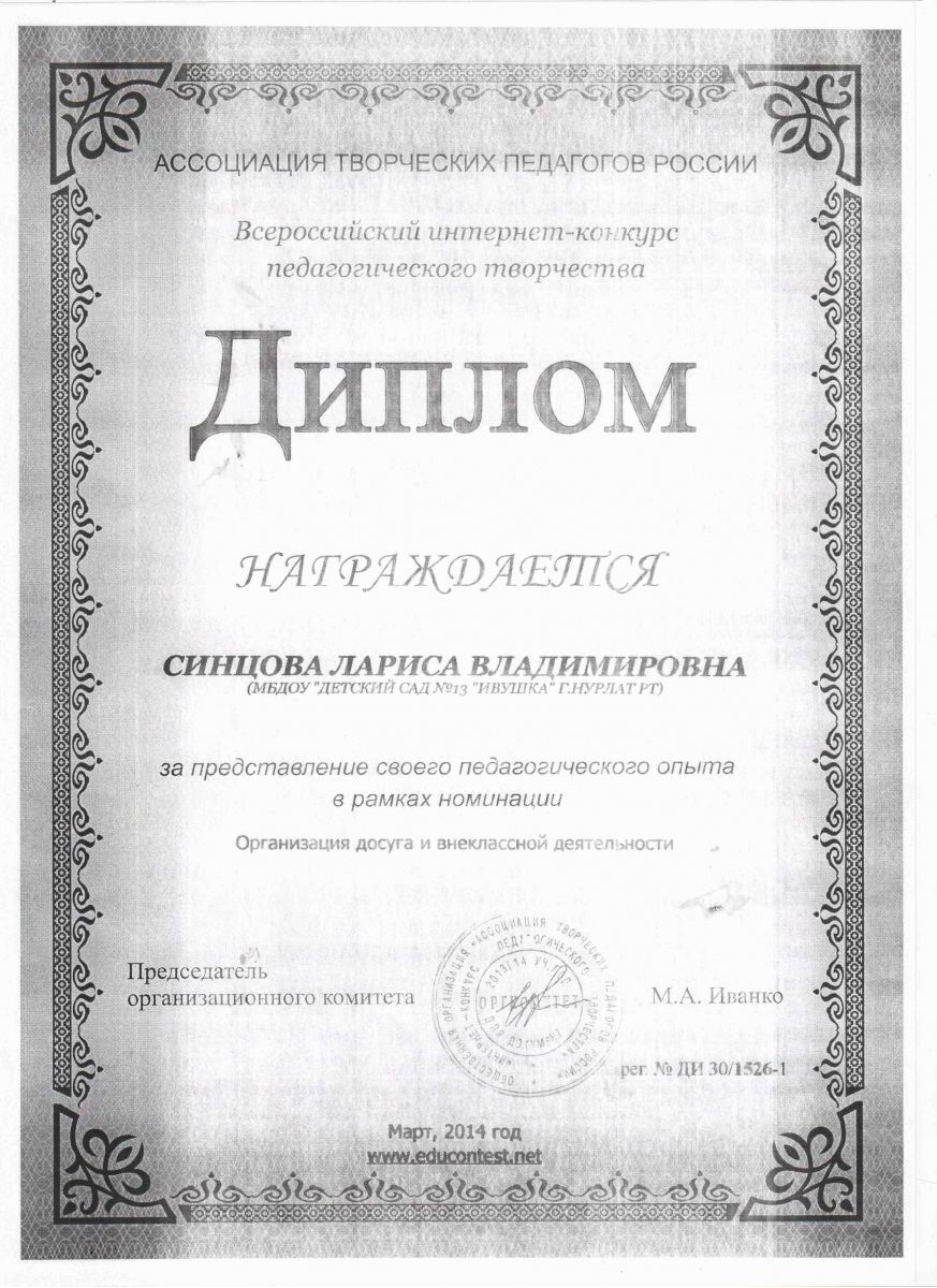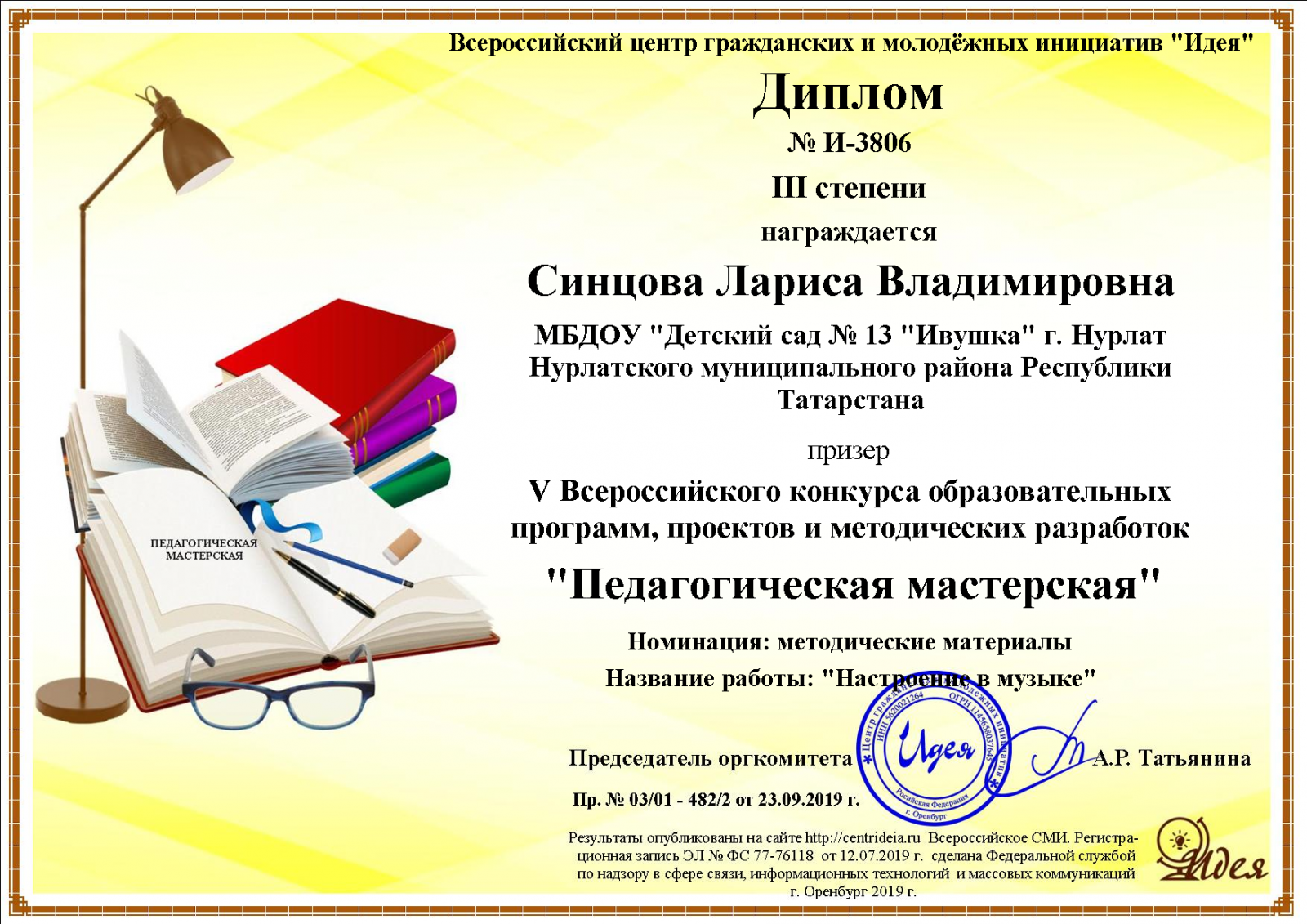 Диплом 3 степени V Всероссийского конкурса "Педагогическая мастерская". (Синцова Лариса Владимировна)