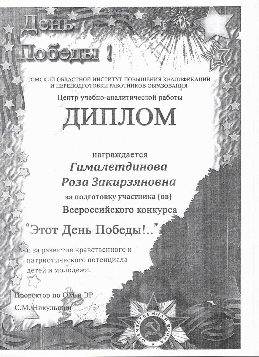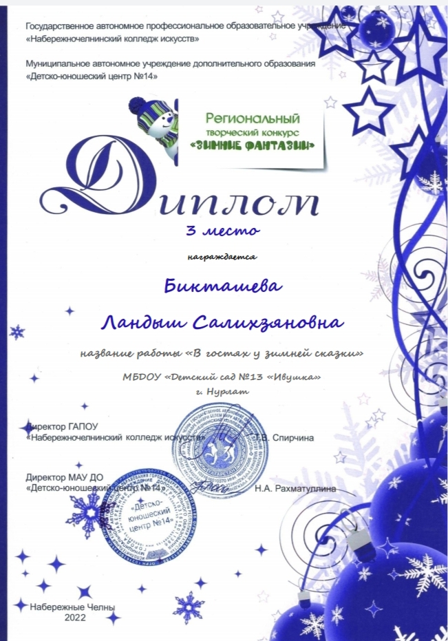 Диплом 3 место. Региональный творческий конкурс "Зимние фантазии" Бикташева Л.С.