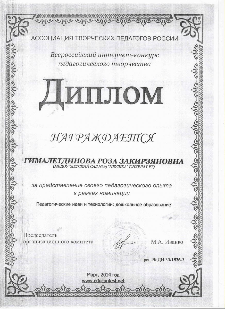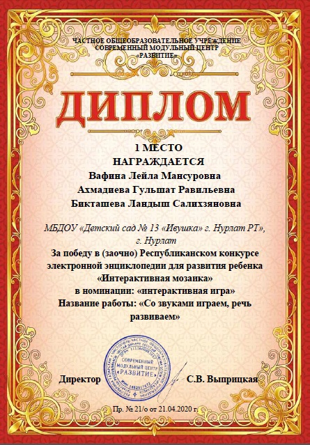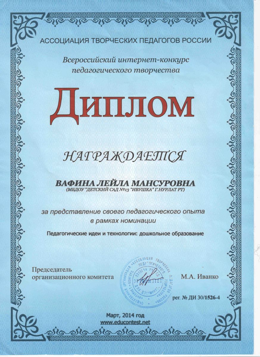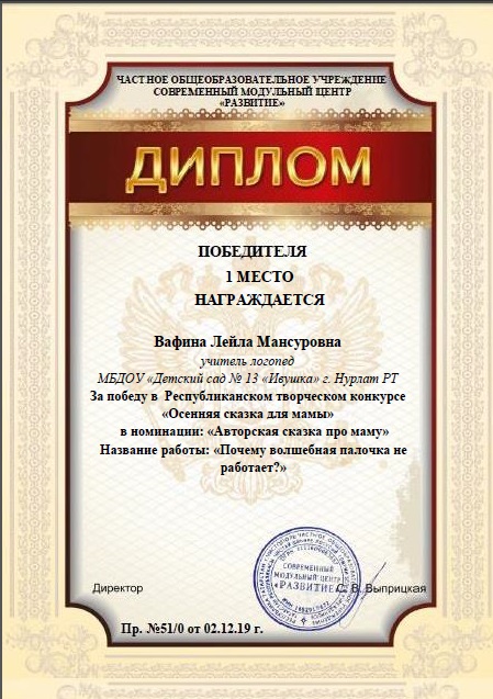 Диплом. 1 место в республиканском конкуосе "Осенняя сказка для мамы" Вафина Л.М.