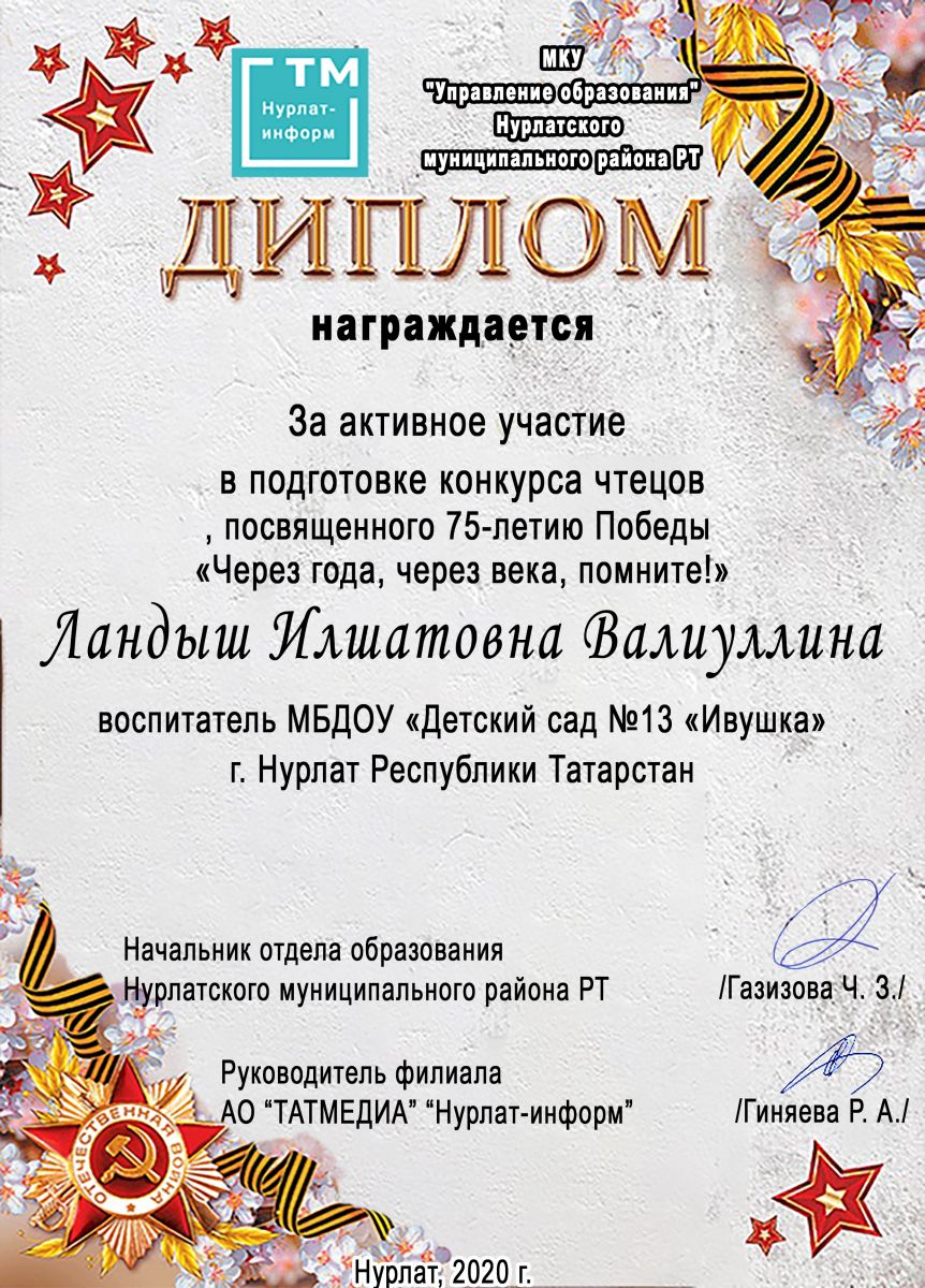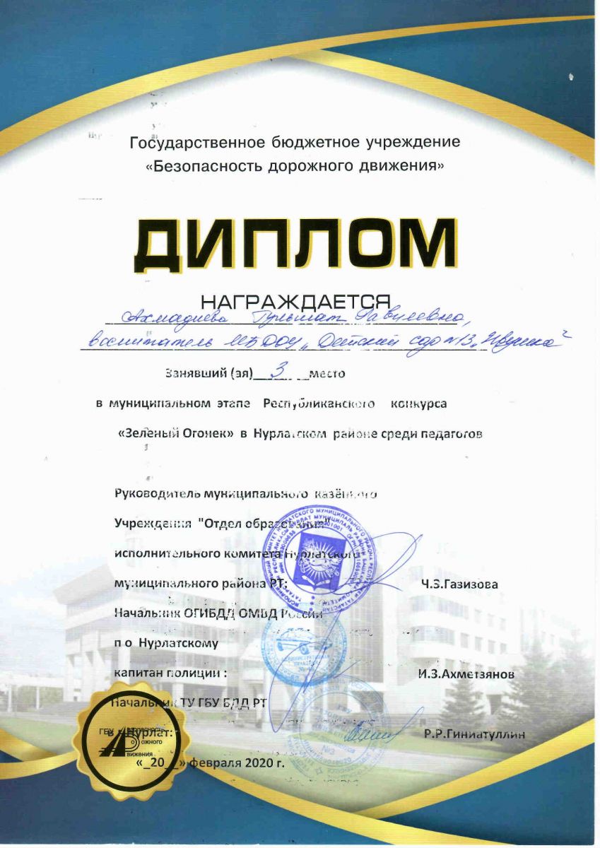 Диплом 3 степени Ахмадиева Г.Р. "Зеленый огонек" 2020 г.