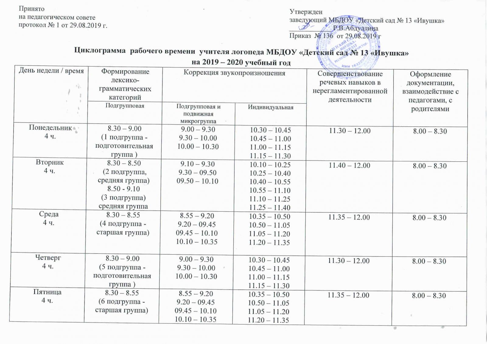 Циклограмма педагогов на 2019 - 2020 учебный год / 2019 - 2020 уку елына педагоглар циклограммасы