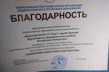 Бүген Пушкин исемендәге Казан мәдәният үзәгендә «Социаль партнерлык территориясе» Бөтенроссия мәгариф берлегенең Татарстан республика оешмасы проектын тәмамлау тантанасы узды. Балалар бакчасы мөдире Нугаева Гөлүсә Вахит кызы, профком рәисе Фәйзуллина Гүзәлия Әнвәр кызы чарада булдылар һәм Рәхмәт хаты алдылар. -