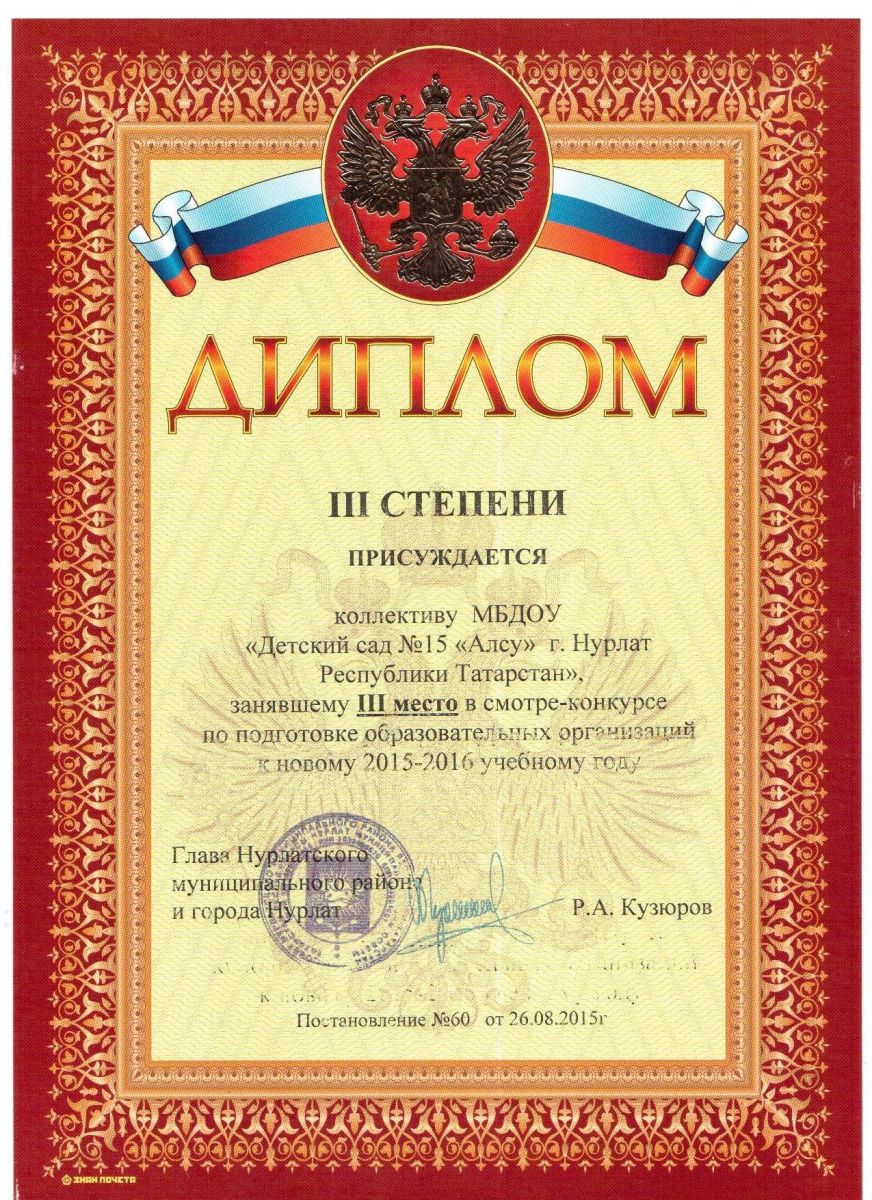 Диплом за III место в смотре-конкурсе по подготовке к новому 2015-2016 учебному году