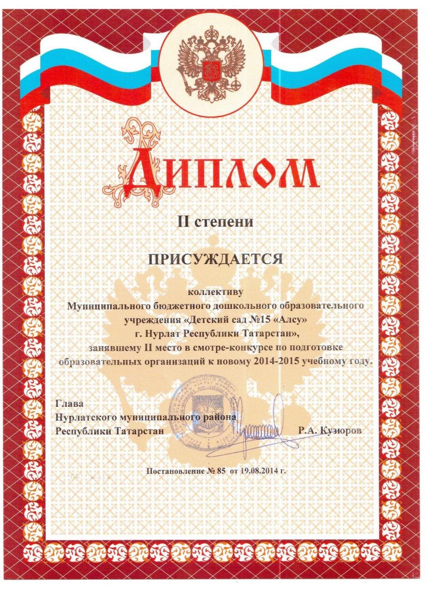 Диплом за II место в смотре- конкурсе по подготовке к новому 2014-2015 учебному году