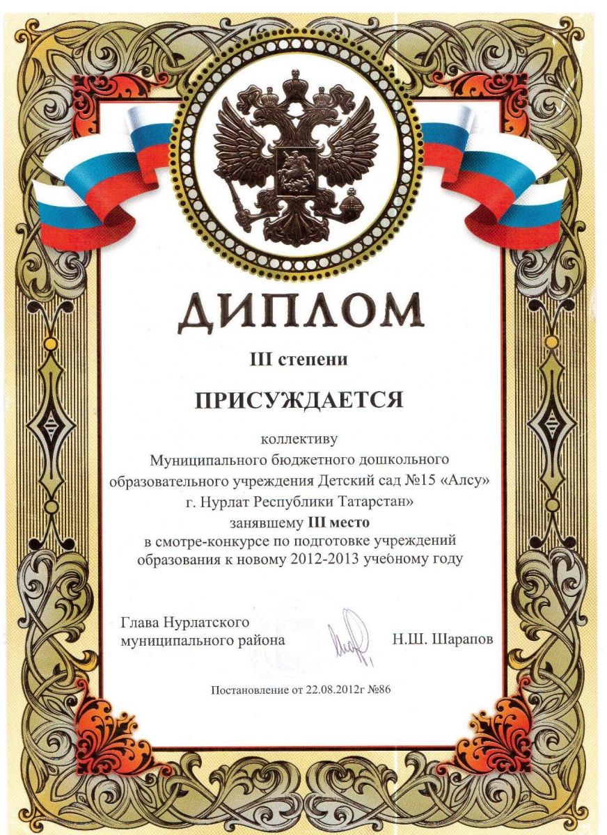 Диплом за III место в смотре-конкурсе по подготовке к новому 2012-2013 учебному году